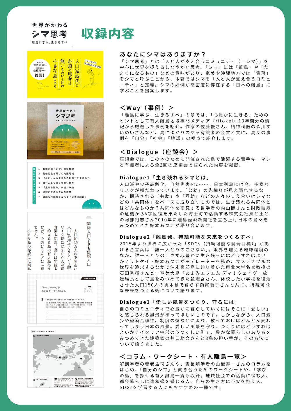 【講義】『世界がかわるシマ思考』をテキストに「シマ(人と人が支え合うコミュニティ)」の基本と、奄美の奥座敷・宇検村出身でシマづくりに心を燃やす栄雄大さんの取り組みに学びます。【対話】参加者自身の「シマ」を言語化