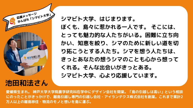 日本唯一の「離島引越し」を専門に創業し、離島というフィールドで工務店、宿泊事業、学生寮など、様々な事業に挑戦している、アイランデクス株式会社・代表取締役の池田和法さんより、ご支援と応援コメントをいただきました!