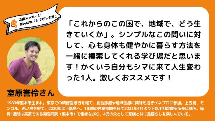 人気漫画『Dr.コトー診療所』で描かれるコトー先生のモデルとなった瀬戸上健二郎先生や、総合医として必要なスキルを離島・へき地にある提携病院で習得するプログラムを提供する合同会社ゲネプロを立ち上げた齋藤学先生が歴代の所長を務め、地域医療を支えてきた下甑島(しもこしきしま|鹿児島県)の手打診療所。その4代目所長の室原誉伶先生より、ご支援と応援コメントをいただきました!