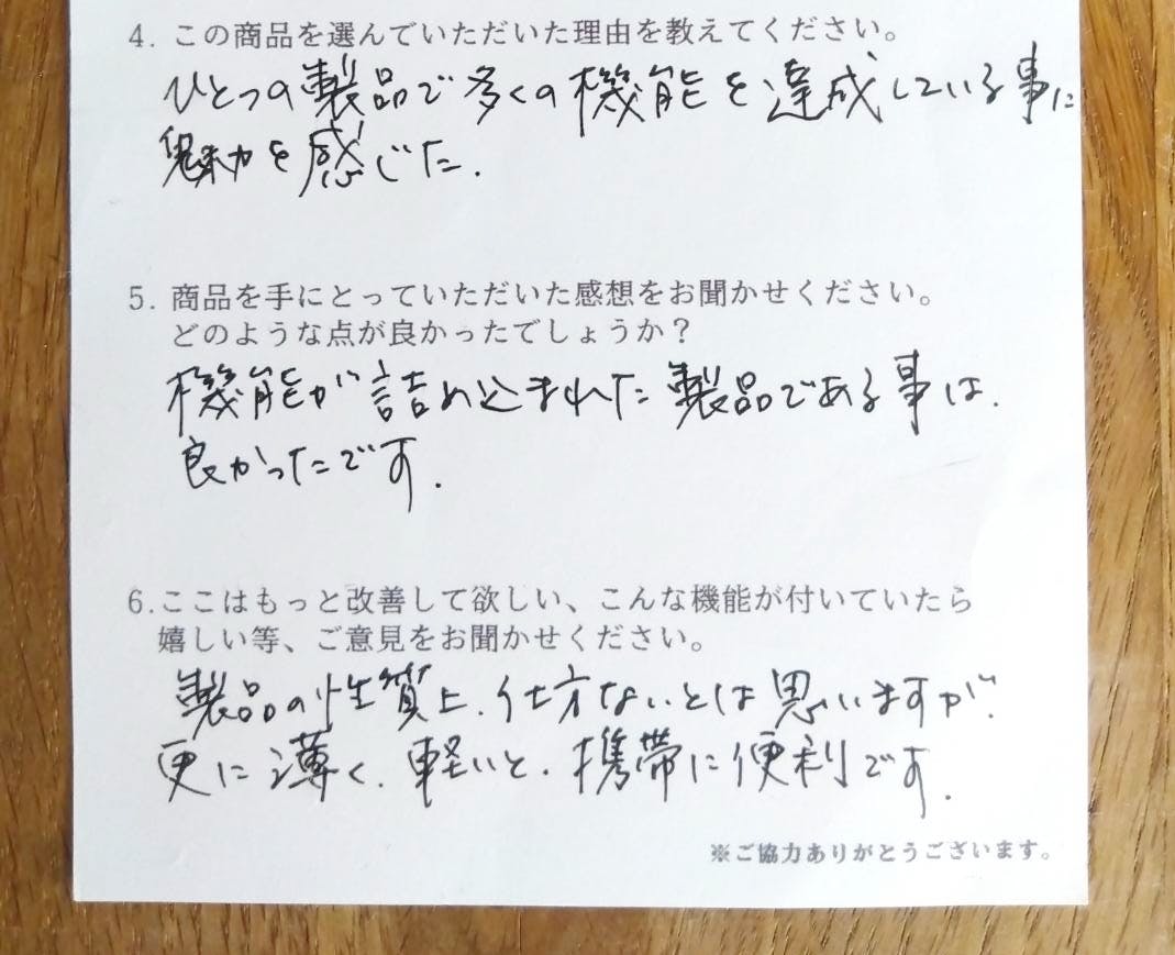 「製品の性質上仕方ない部分もありますが、さらに薄く・軽くなると携帯性がより高まると思います。」
