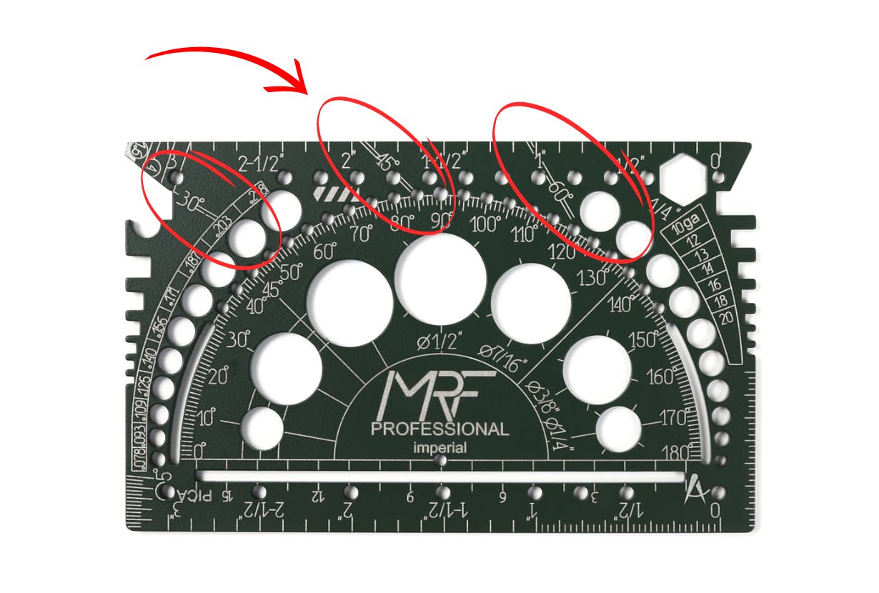 ① 簡易測定機能として、外枠に30°・45°・90°の角度目盛がついていること。(写真の印の所)ちょっとした角度の確認に便利。「サッと測れて意外と重宝する!」と一級建築士の方からも好評でした。