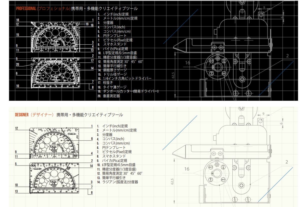 本日の写真は、定規を収納するカードホルダー(上がプロフェッショナル、下がデザイナーズ)。こちらにも各機能の説明が載っています。