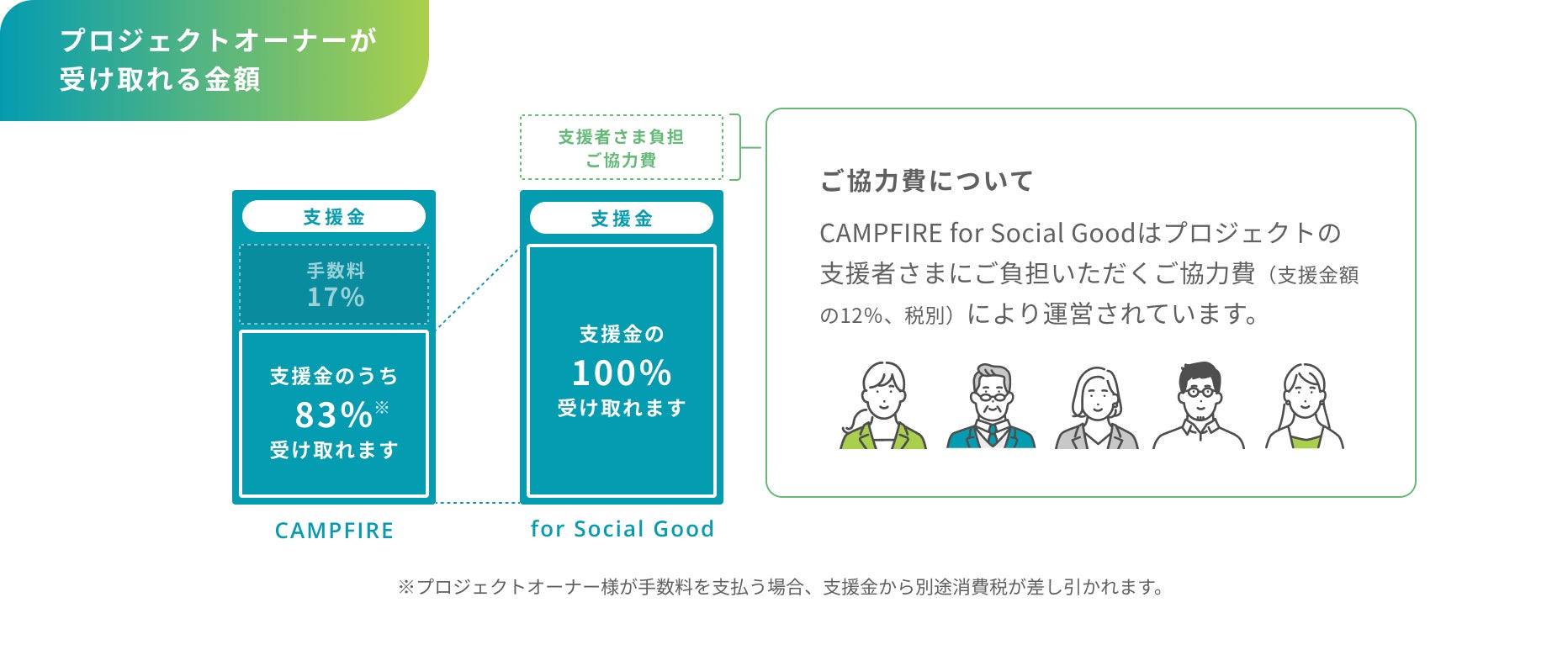 CAMPFIRE for Social Goodでは、集まった支援金額からは手数料を一切いただかず、100%プロジェクトオーナーが受け取ることができます。決済手数料も含めてプロジェクトオーナーのご負担は一切ありません。
