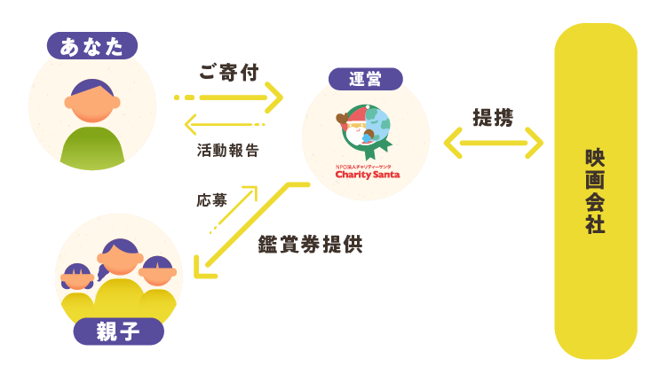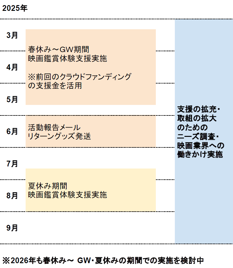 趣旨に賛同いただいた皆様から寄付を募り、映画鑑賞券(※)の費用などに充てることで毎年継続して実施していきます。