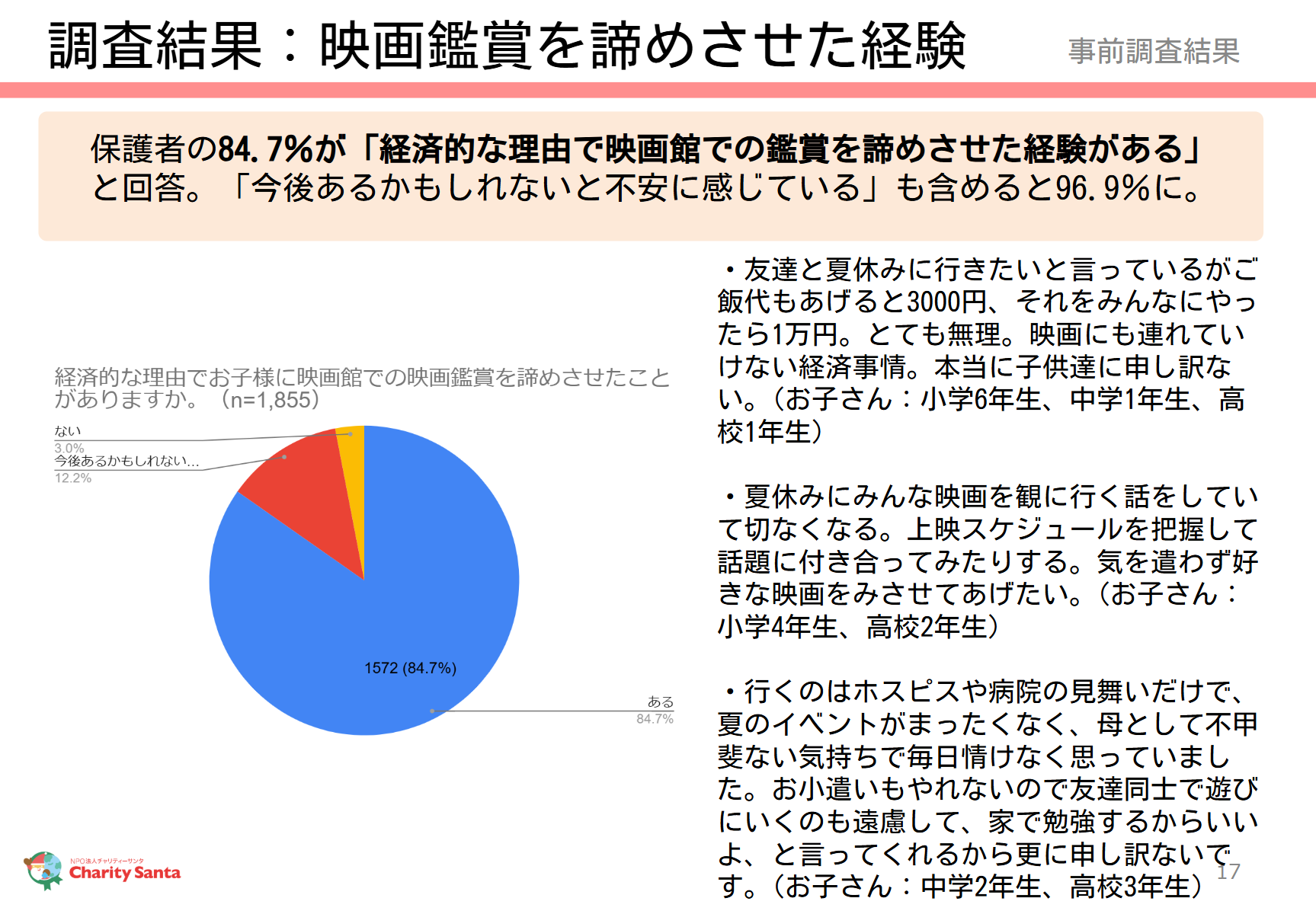 2024年夏のテスト実施にあたり、私たちが支援している生活困窮家庭に映画鑑賞に関するアンケート調査を行ったところ、8割以上の家庭が【経済的な理由で映画館での鑑賞を諦めさせた経験がある】ことがわかりました。(回答数:1,855件)