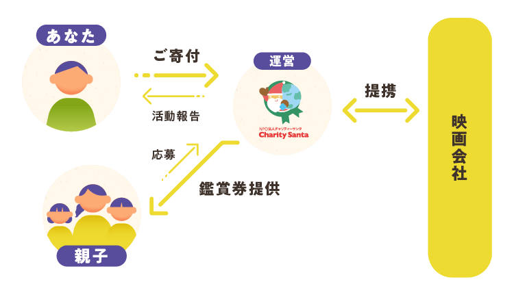 趣旨に賛同いただいた皆様から寄付を募り、映画鑑賞券(※)の費用などに充てることで毎年継続して実施していきます。