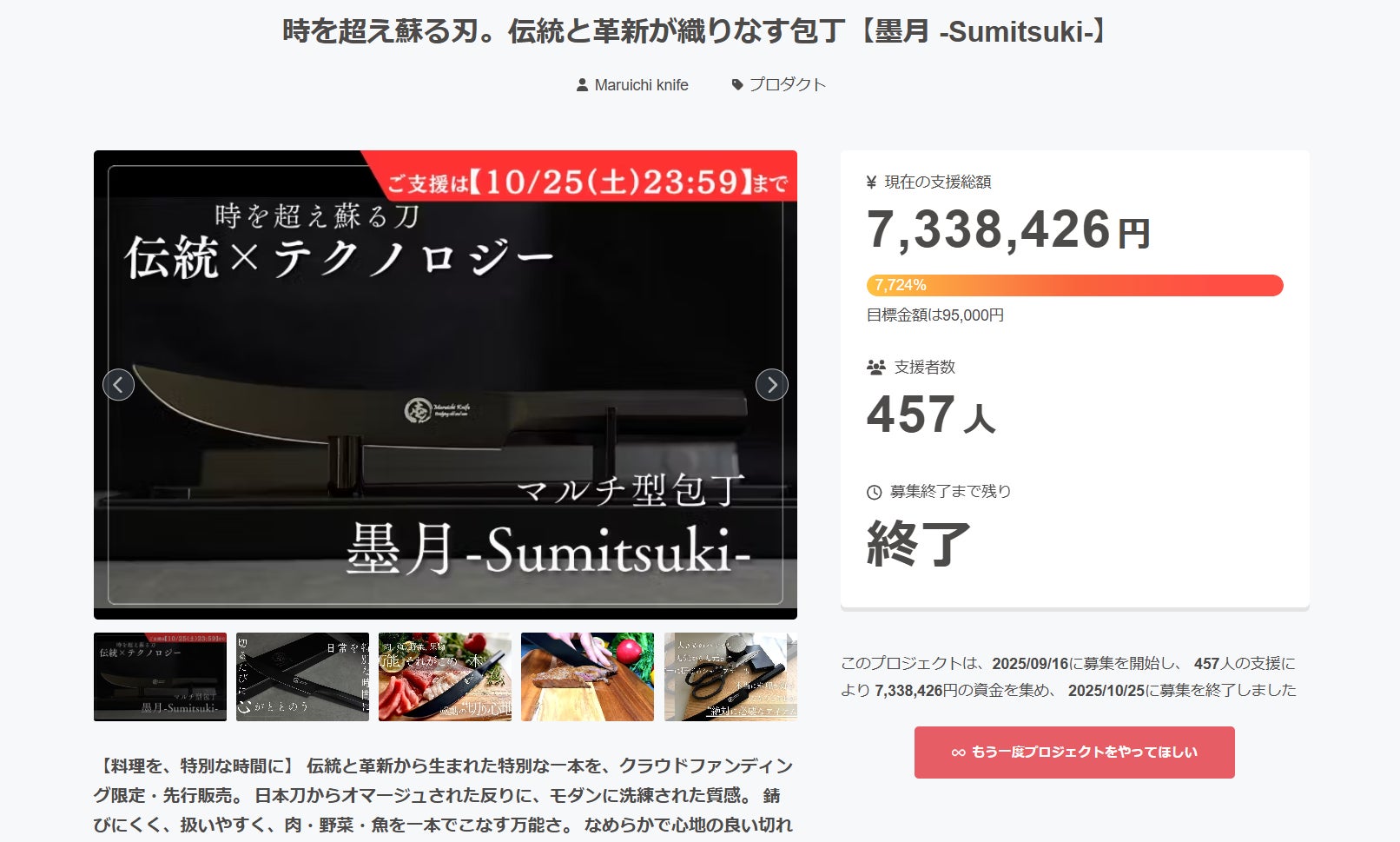 こんにちは、Maruichi Knifeです。昨日(10月25日)をもちまして、無事クラウドファンディングの挑戦が終了いたしました。支援総額は、なんと 7,338,426円!当初の目標を大きく上回るご支援をいただき、本当に多くの方に応援していただきましたこと、心より感謝申し上げます。現在は集計および発送準備に入っております。一部の商品は、ただいま職人が心を込めて製作を進めており、11月中の納品を予定しています。到着次第、すみやかに検品・発送を行わせていただきます。また、商品を複数ご購入いただいた方につきましては、発送の都合上、同梱してお送りする場合がございます。何卒ご理解賜りますようお願い申し上げます。商品がお手元に届くまで、今しばらくお待ちくださいませ。そして、皆さまから本当にたくさんのご支援をいただいたことを受け、なんと現在、第二弾の包丁を考案中です!第一弾の「墨月 -Sumitsuki-」と同様に、“伝統と革新”をテーマに掲げ、今度は「知っているけれど持っていない」「欲しいけれど何となく買えていない」——そんな“あの包丁”を、Maruichi Knifeらしいスタイルでお届けできるよう、案を練っております。お披露目はおそらく年明けごろになりそうですが、進捗は随時お知らせいたしますので、ぜひご期待ください。もちろん、現在は第一弾「墨月 -Sumitsuki-」のお届けを最優先に進めております。皆さまのお手元に無事届くまで、最後まで責任を持って対応してまいります。今後とも、Maruichi Knifeをどうぞよろしくお願いいたします。Maruichi Knife 代表 工藤