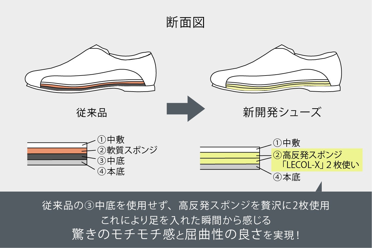 この高反発スポンジの贅沢2枚使いとボロネーゼ製法が足を入れた瞬間から感じる驚きのモッチモチ感と屈曲性の良い優しい履き心地を実現させました