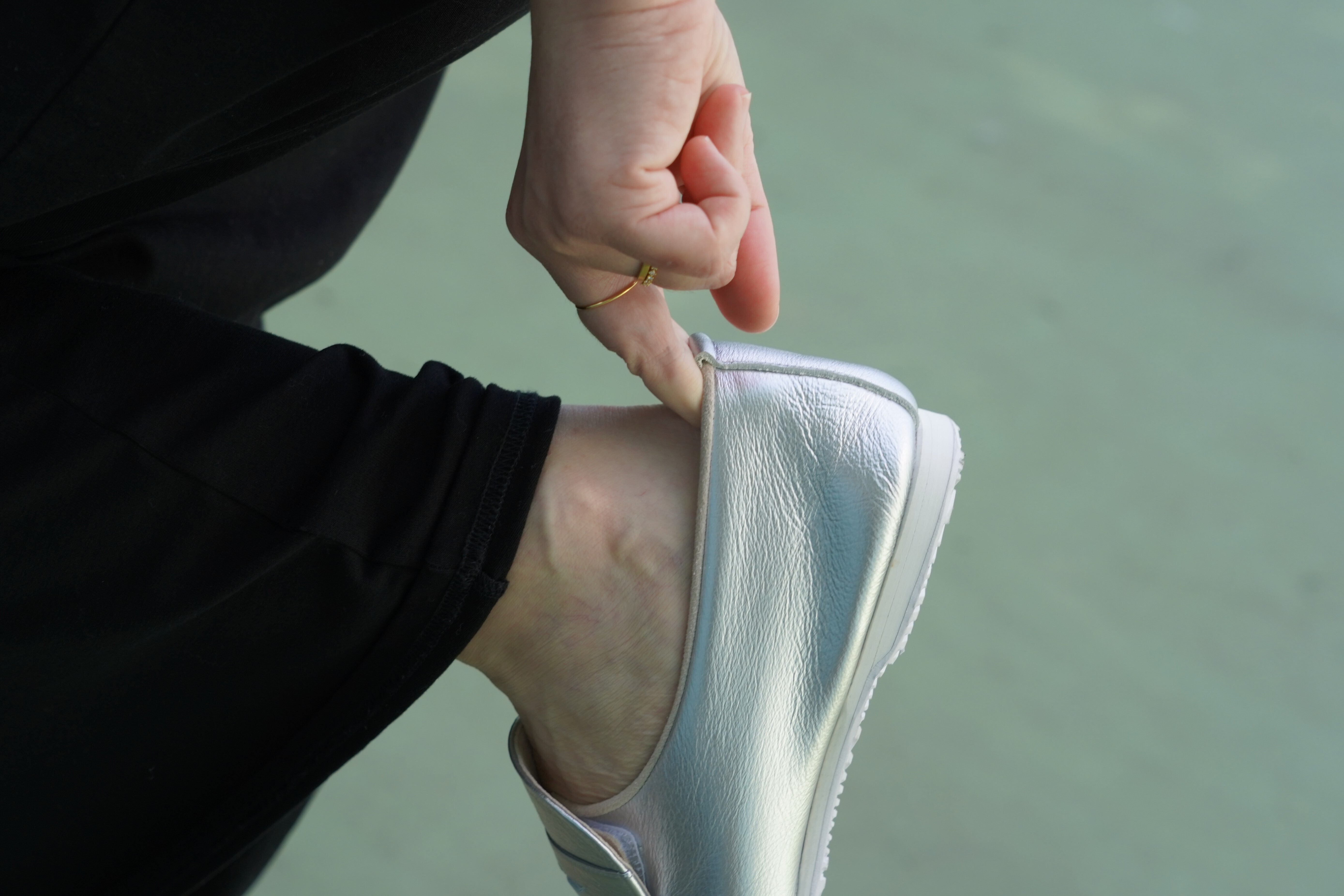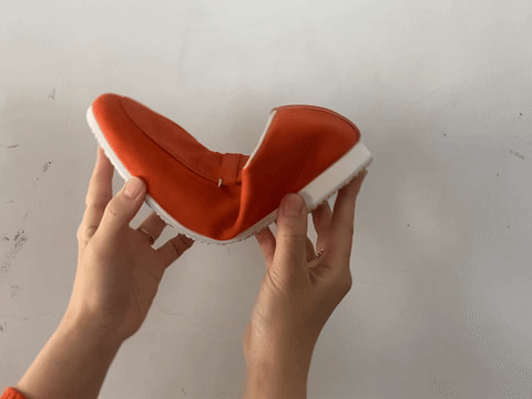 通常靴にはかかととつま先に硬い芯材が入っていますが、この靴はそれらを入れない為、クタっと柔らかく、様々な足の形になじみ包み込まれる優しい履き心地を実現しました