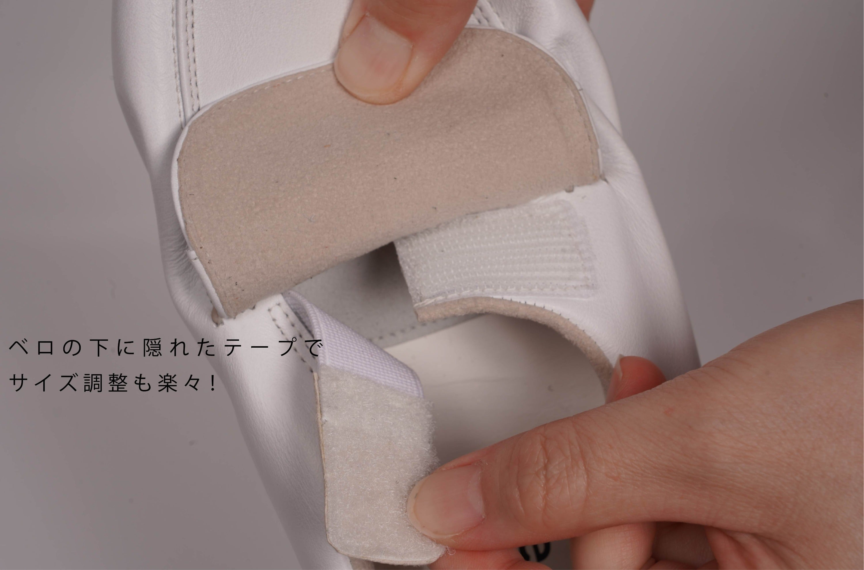 ベロの下に隠れたサイズ調整出来るテープ
