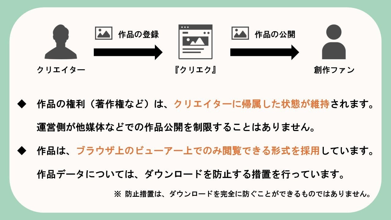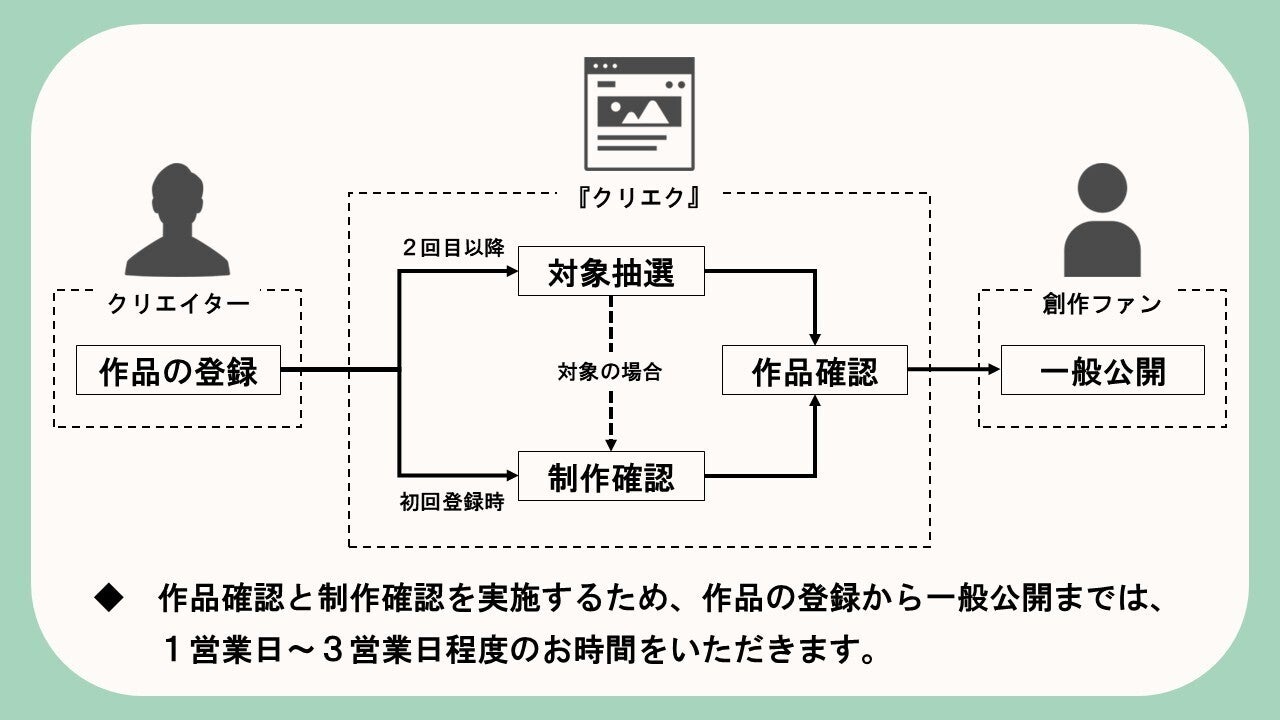 これら「作品確認・制作確認」を通過した作品だけがプラットフォーム上で公開されるため、クリエイターの方々と創作ファンの方々、双方が安心して『クリエク』上での活動を楽しむことができます。