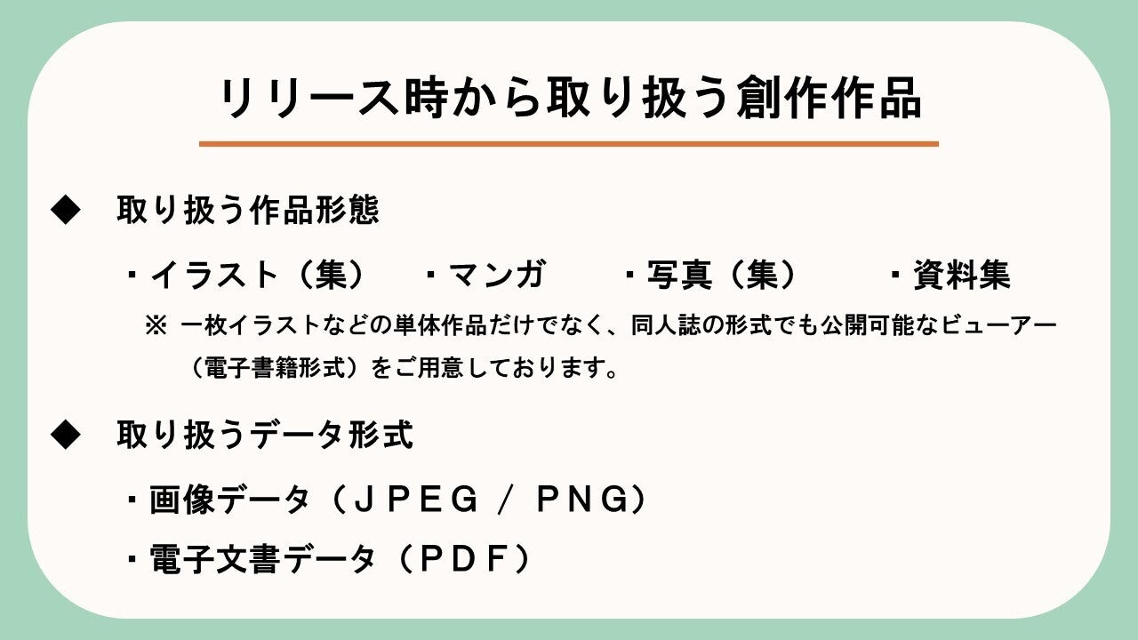 なお、取り扱う作品形態・データ形式については、アップデートによる範囲の拡大を予定しています。