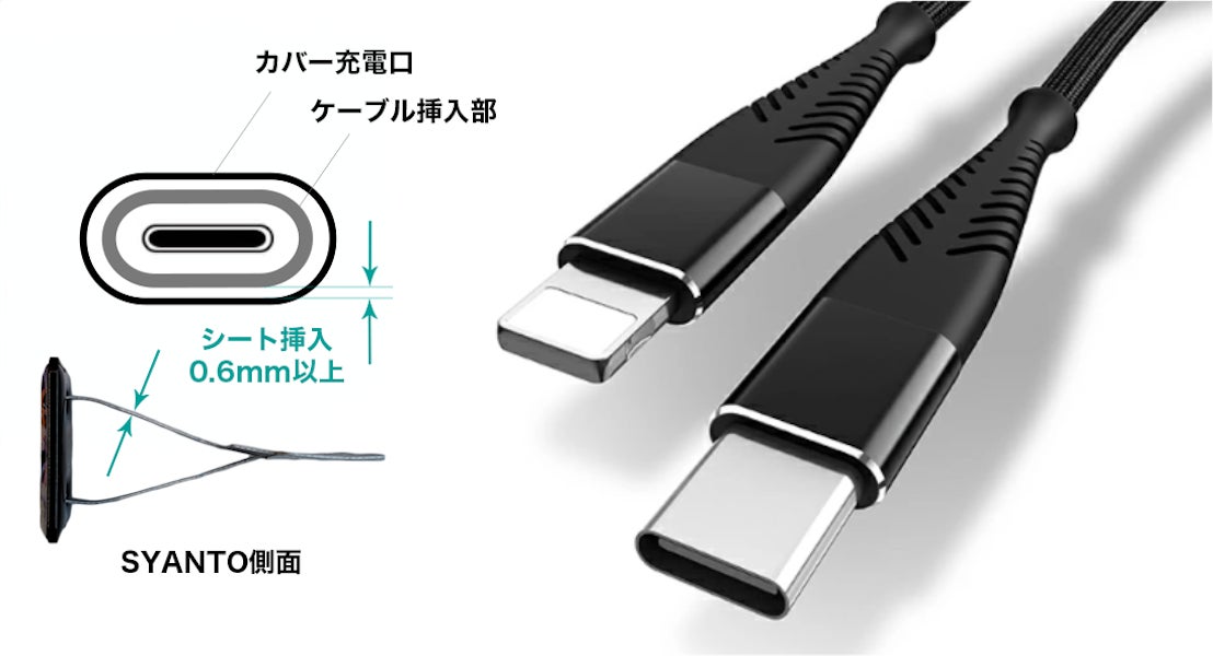 取り付けにあたり、SYANTOのシート厚さは0.6mmのため、ケースとケーブルは充電口径とケーブル挿入部に0.6mm以上の隙間ができる組み合わせのものをお選びください。