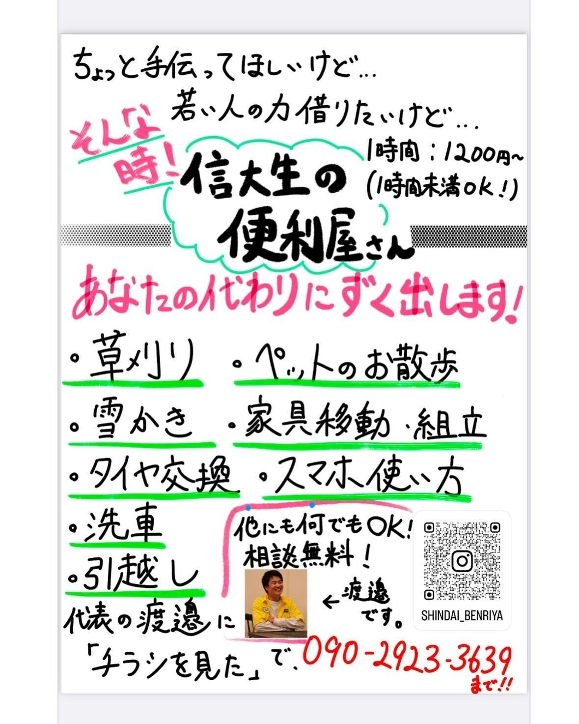 また、同じく私、渡邉が始めた、「信大生の便利屋」利用1500円引きのチケット提供いたします。