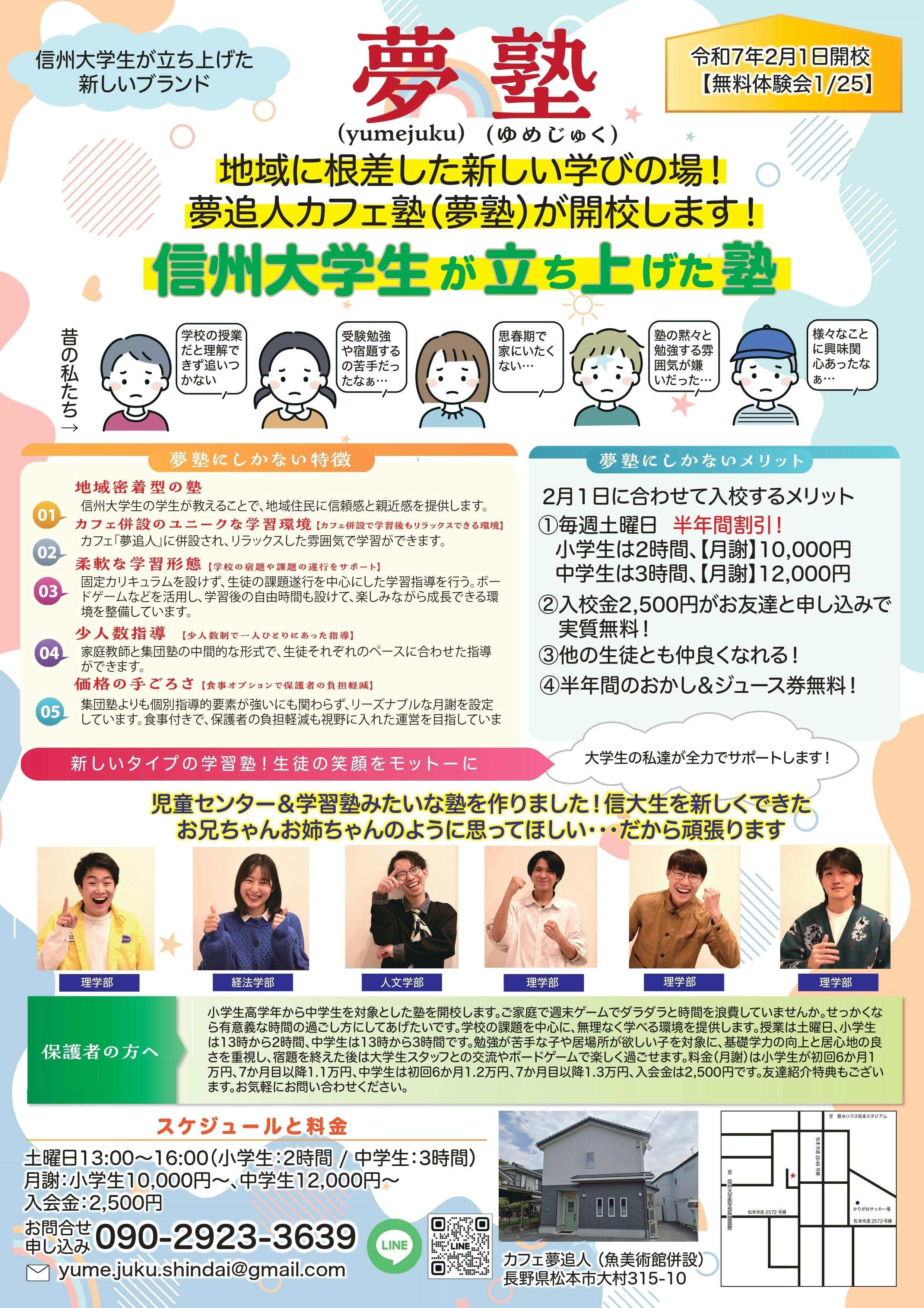 自分やその他周りの大学生の経験をもとに、世界はもっと広くて、知らないことが沢山あるのだと、松本市の小中学生に知ってもらいたい。そのためにも、考え方やコミュニケーション能力を向上させ、今後、社会へはばたく小中学生に多様な価値観をはぐくむ場所として「夢を追うための塾」通称「夢塾」を開校し、信州大学生と地域の子供を持つ家庭の半永続的な場所を創りたい。