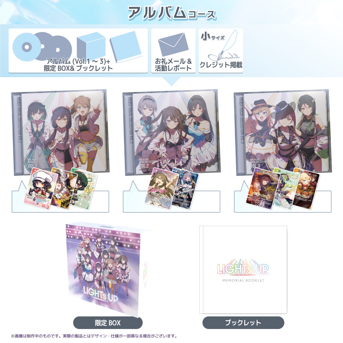 収納BOXとメモリアルブックレットは、どちらも本クラウドファンディングの限定品です。また、クラウドファンディング後の一般販売は「ボーカルコレクション」の個別販売のみとなります。