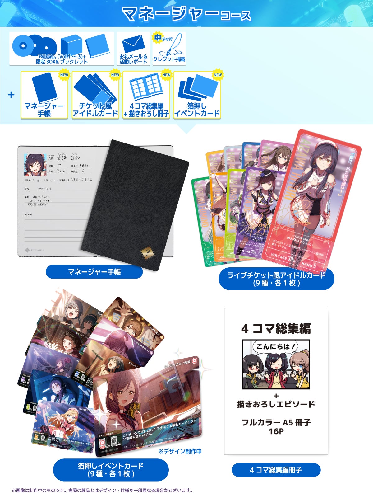 さらに上のプロデュースのために!「マネージャーコース」は、アイドルたちのことを深く知るためのアイテムたちです。マネージャー業務を通じてアイドルたちと親睦を深め、プロデュースの腕前を磨こう。ライブ(ゲーム)を華やかに彩るアップグレードカードも使って、特別なステージを演出しましょう!