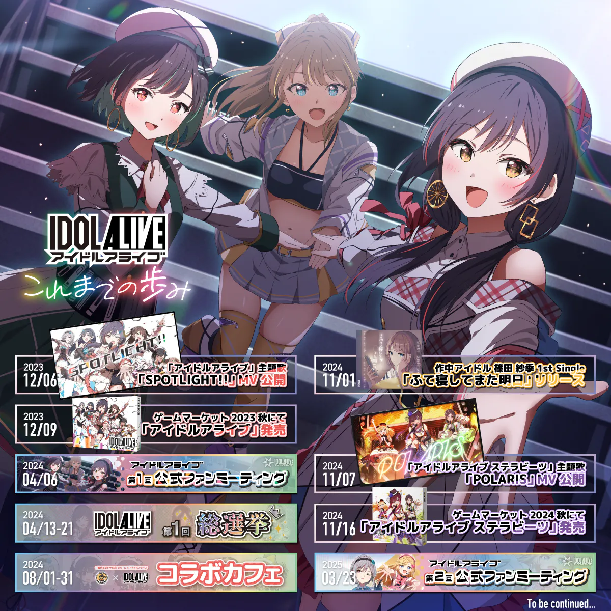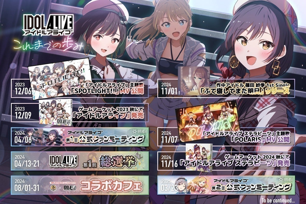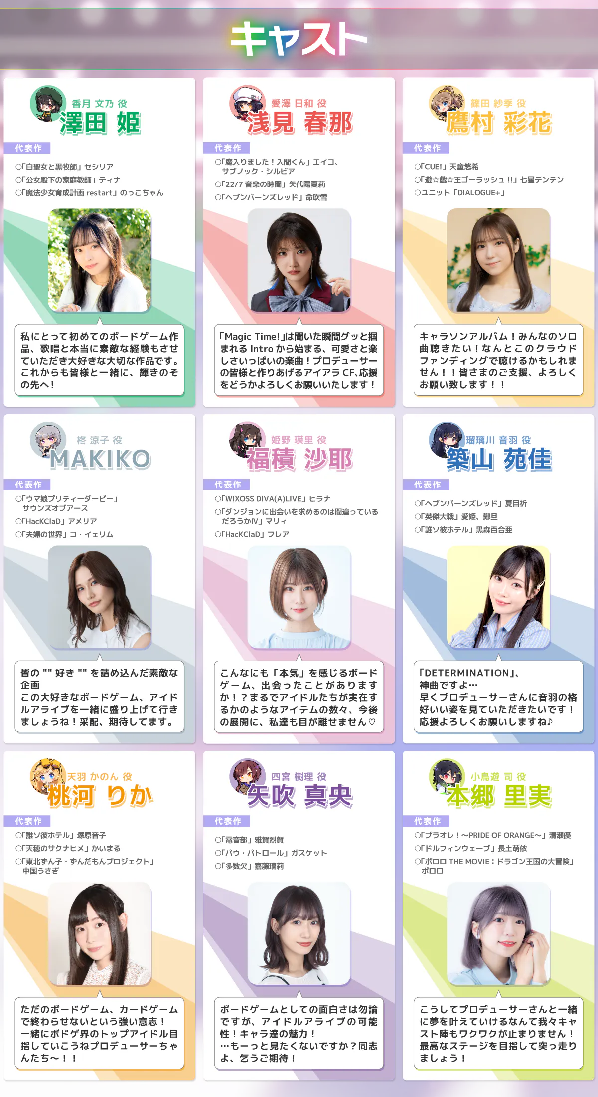 登場する9人のアイドル全員のボイスをプロの声優が担当し、ボードゲームとしての展開のみならず、主題歌とMVの制作、コラボカフェ、総選挙、声優をゲストに招いたファンミーティングなどの活動も行ってきました。