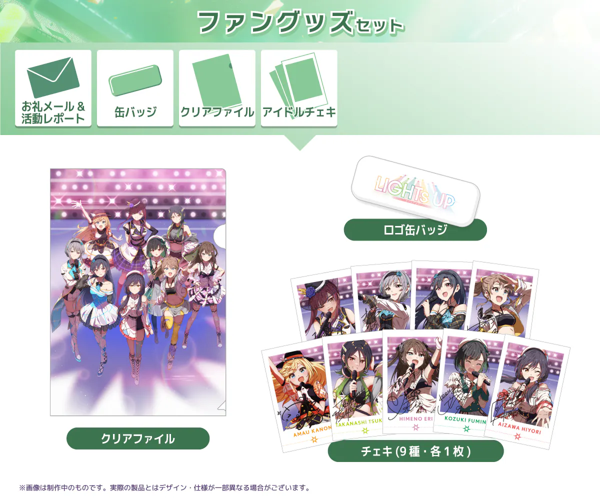 リアルライブ開催の夢を、一緒に!「ライブプロデュースコース」では、今はまだ架空のライブ『LIGHTs UP』のグッズと関係者パスが入手できます。これらのグッズを身に着けてライブで熱狂する景色を現実にする。ぜひともこの夢を私たちと一緒に追いかけてください。