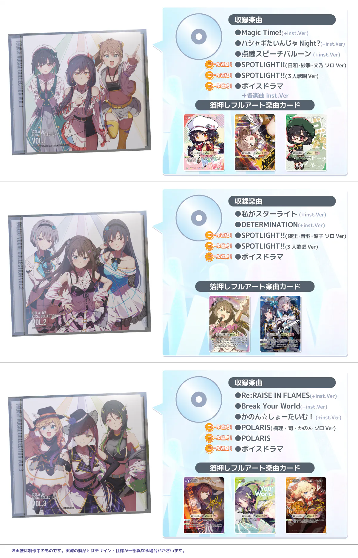 アルバムは「ボーカルコレクションvol.1~3」のCD3枚組!合計8曲の新規書き下ろし楽曲が収録されます。また、収録楽曲に対応する箔押しフルアート仕様のプロモーションカード(ゲームで使える「楽曲カード」)が同梱されます。