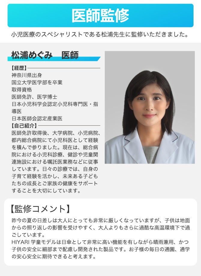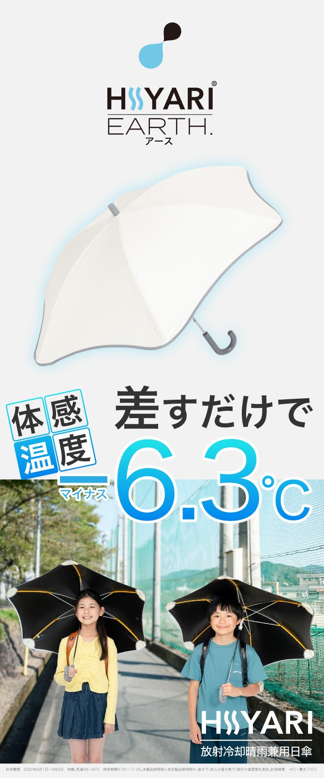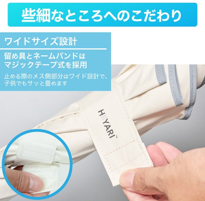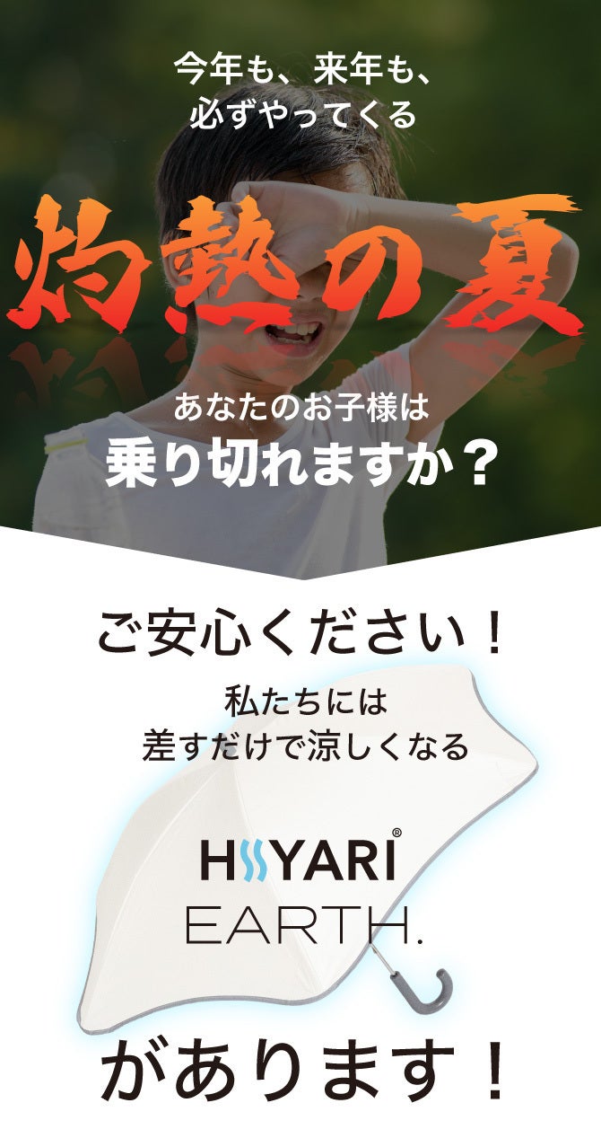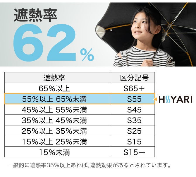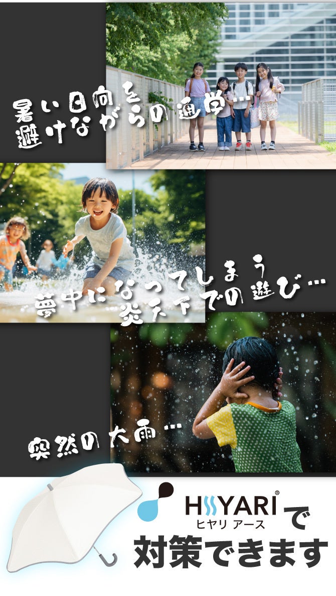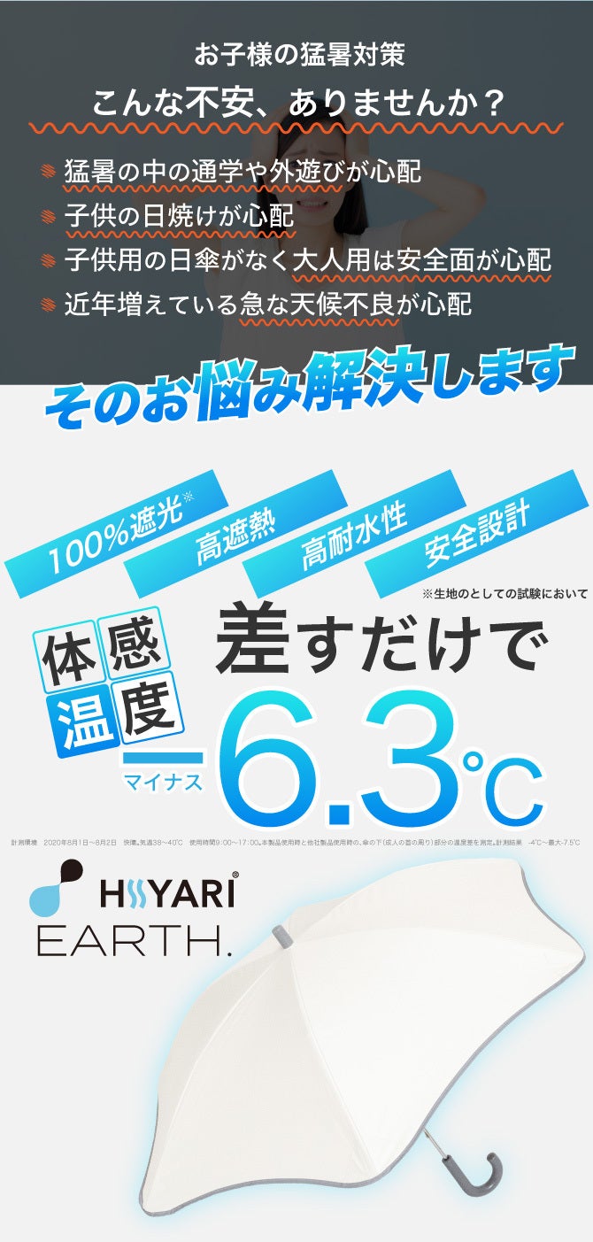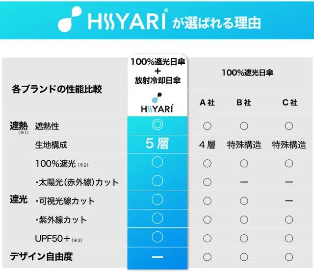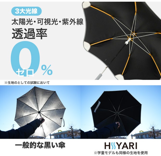 ※1 一般財団法人カケンセンターの遮熱性実験(JIS L 1951)にて、一部の他社「完全遮光日傘/100% 遮光日傘」よりHIYARI®︎が優れた遮熱効果があることを比較立証済みです。
