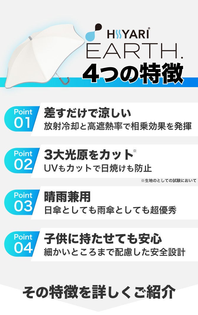HIYARI EARTH.は完全遮光日傘。太陽光、可視光、紫外線の3大光線の透過率トリプルゼロを実現!第3者検査機関において認定を受けた正真正銘のトリプルゼロ日傘です。