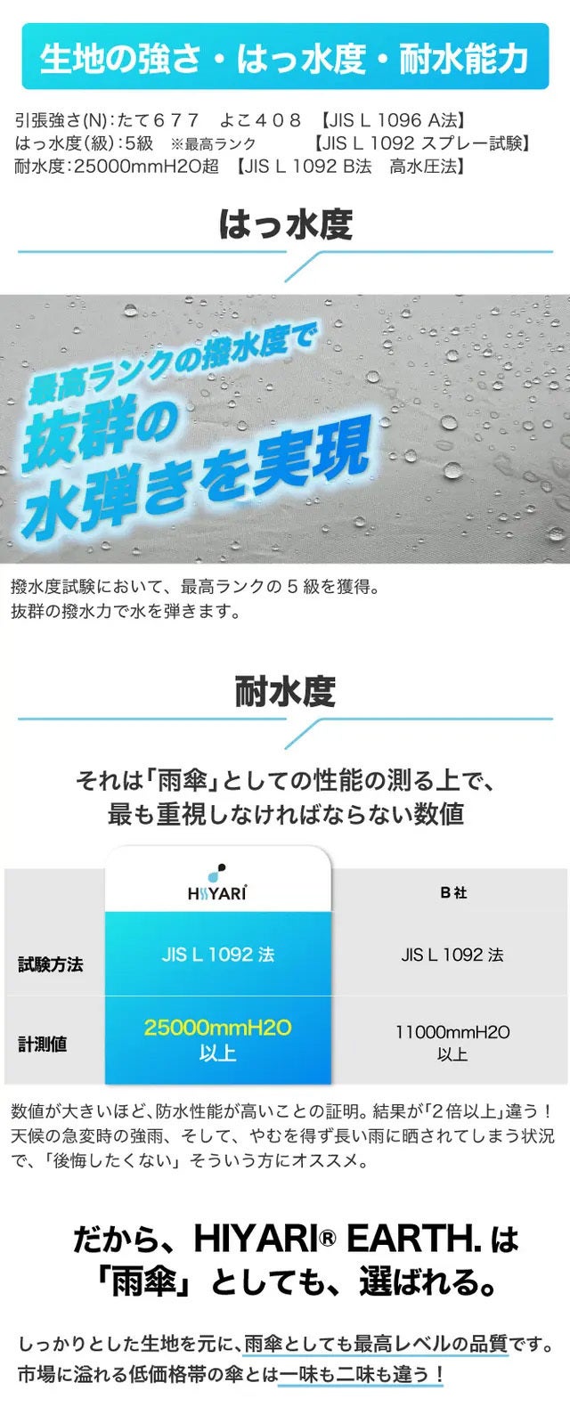 HIYARI®は、晴雨兼用の日傘として、雨の日も不安なく使用できます。極めて高い冷却機能だけではなく、防水性・撥水性・耐風性についてもしっかりと検証済です。