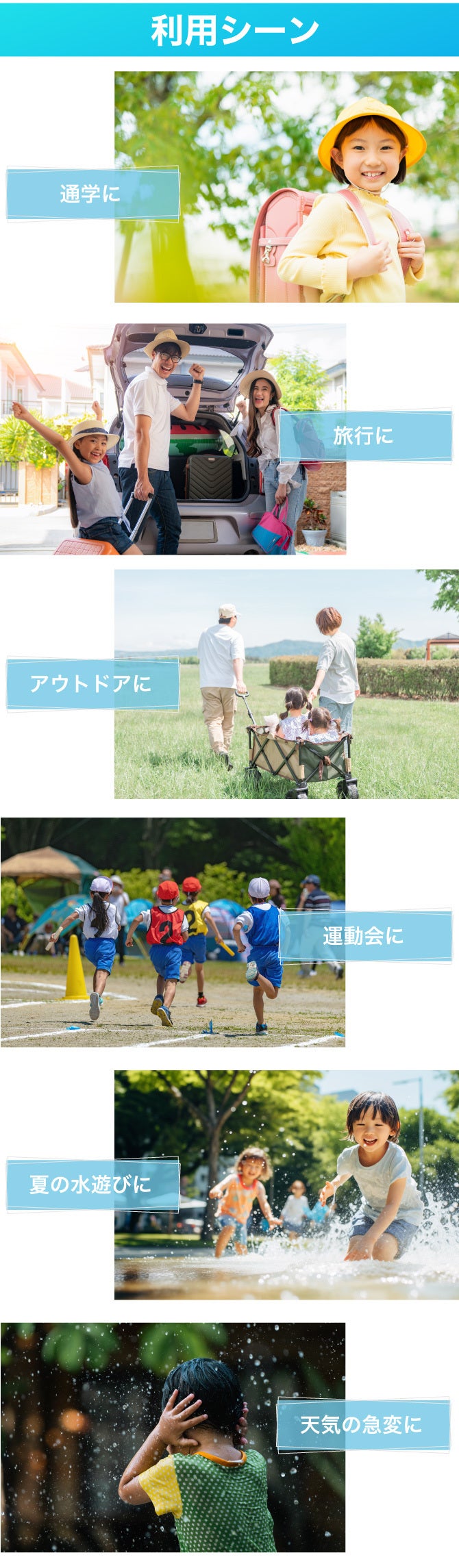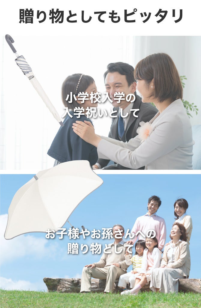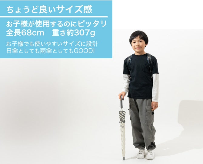 A:年長さんから小学校高学年までを想定しております。子供の発育状況は個々で異なります。事故やお怪我することがないよう、保護者の方が責任をもって使い方の指導をお願いいたします。傘を使用したお子様が怪我をされても弊社は免責とさせていただきます。