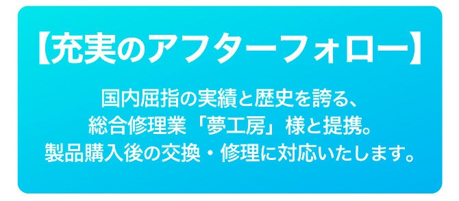 A:製品の初期不良・交換・修理は、ご紹介致しました「夢工房」様にて対応頂きます。全国からのオンライン対応(郵送・宅配)、首都圏の各店舗への持ち込みに対応可能です。
