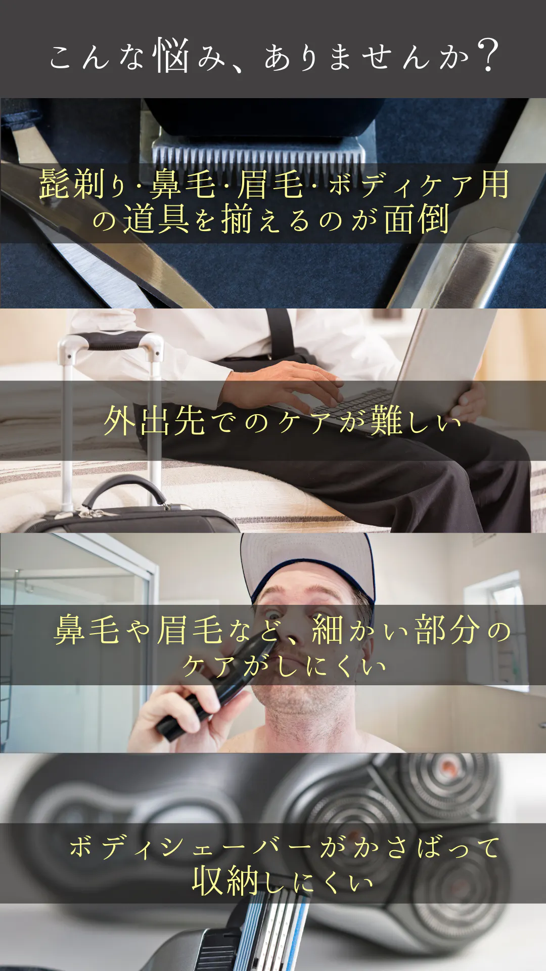 専用のアタッチメントを交換することで、それぞれの部位に適したケアが可能。収納スペースを取らず、複数のシェーバーを使い分ける手間も省けます。