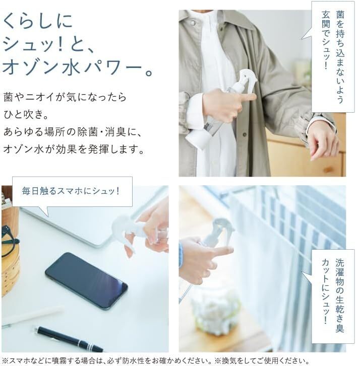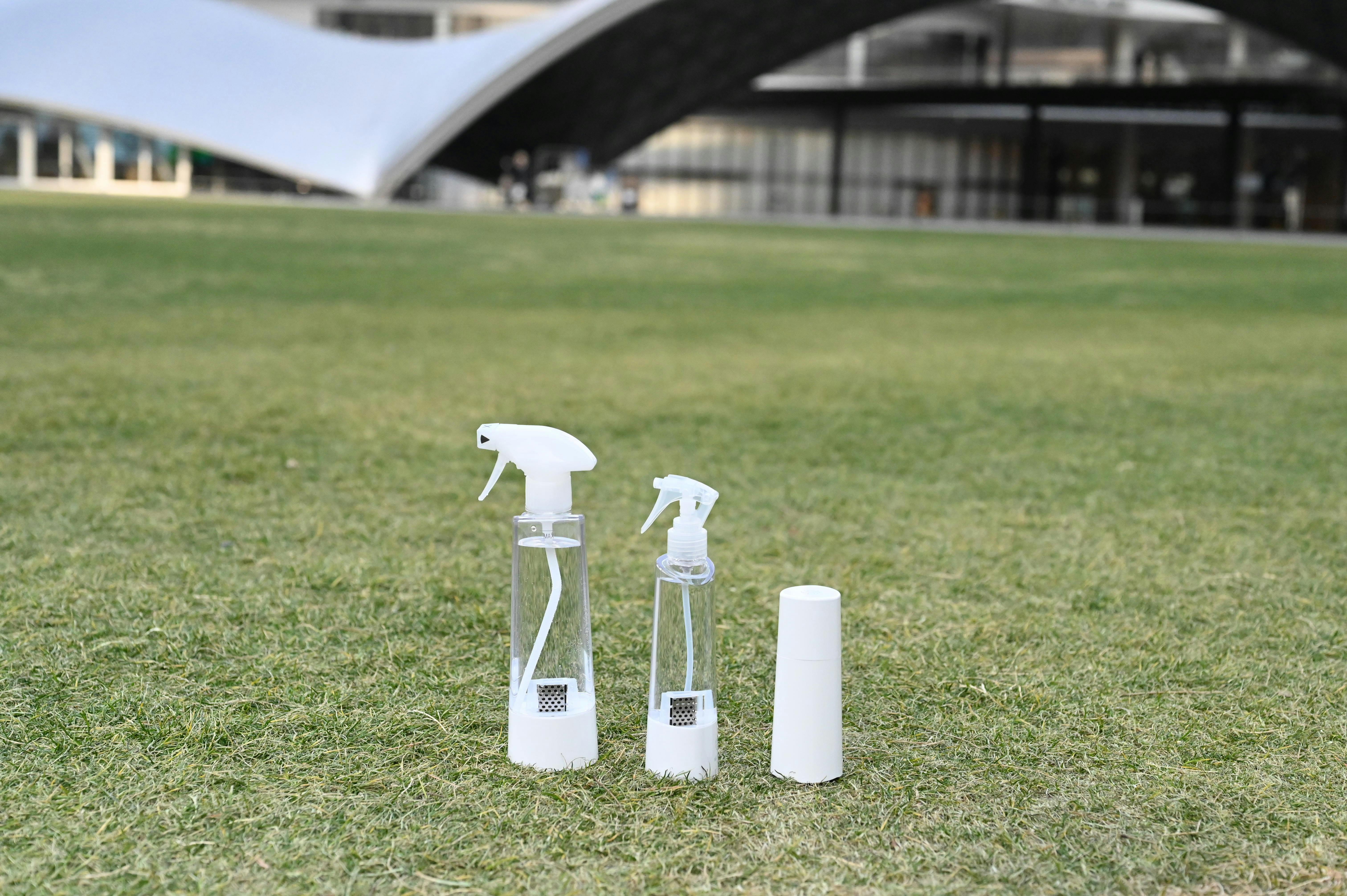 この使い切りのオゾン水スプレーでは、長期間水面に浮上せず浮遊させたままに出来るナノバブル特性を利用し物理的にオゾンをナノバブルに閉じ込め、「オゾン」をスプレーボトル内に長期滞在させる仕組みで製品化されています。