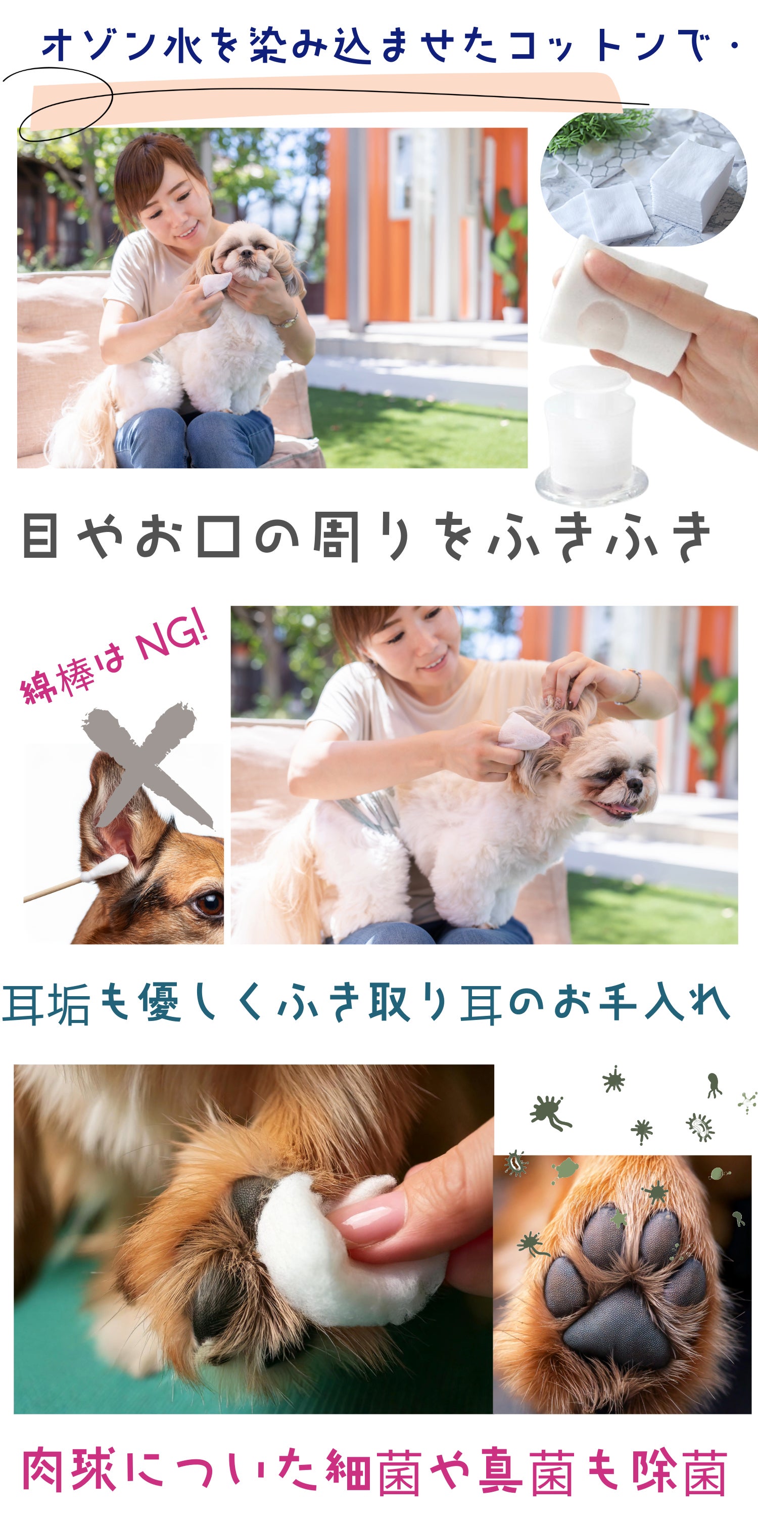 愛犬が慣れるまで歯ブラシを使うのは難しいと思います。そんな場合、コットンガーゼにオゾン水を湿らせ「歯みがきシート」の要領で指で拭くのがオススメです。