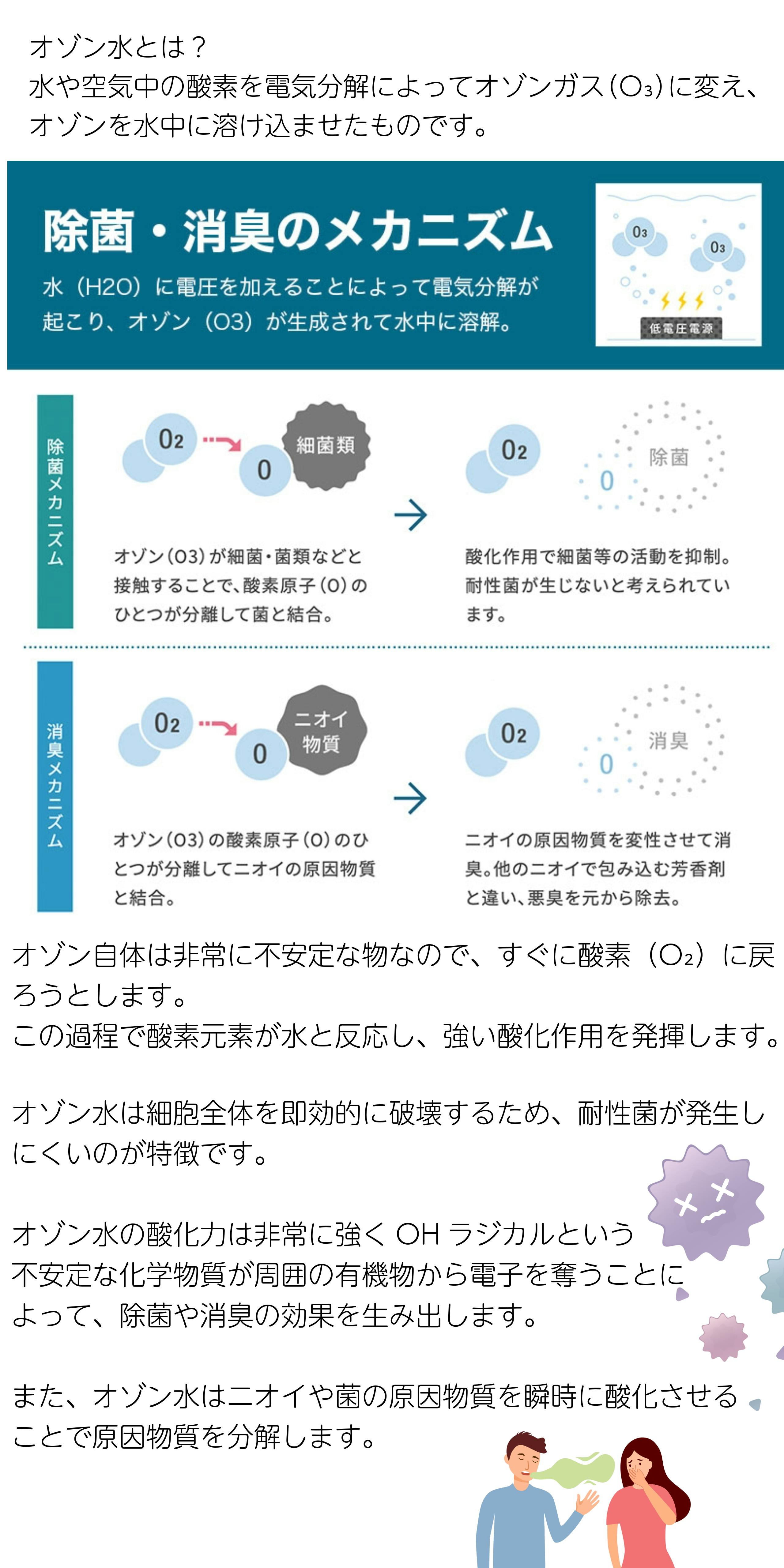 オゾン水は効率的に除菌が出来、薬品や化学製品で人工的に化合したものではなく成分は水なので残留毒性が無く安心安全です。
