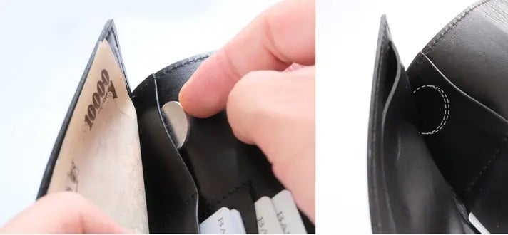 A・お札を収納する際は財布の奥までしっかり差し込んでもらえれば一般的な使用で落ちることはございません。SpilimLsは収納されたカードや硬貨等で紙幣を挟む構造です。カードや小銭をほとんど入れないでご使用になる場合は挟む力が弱くなるため、【サブポケット】に硬貨やその他の物を入れてご使用ください。