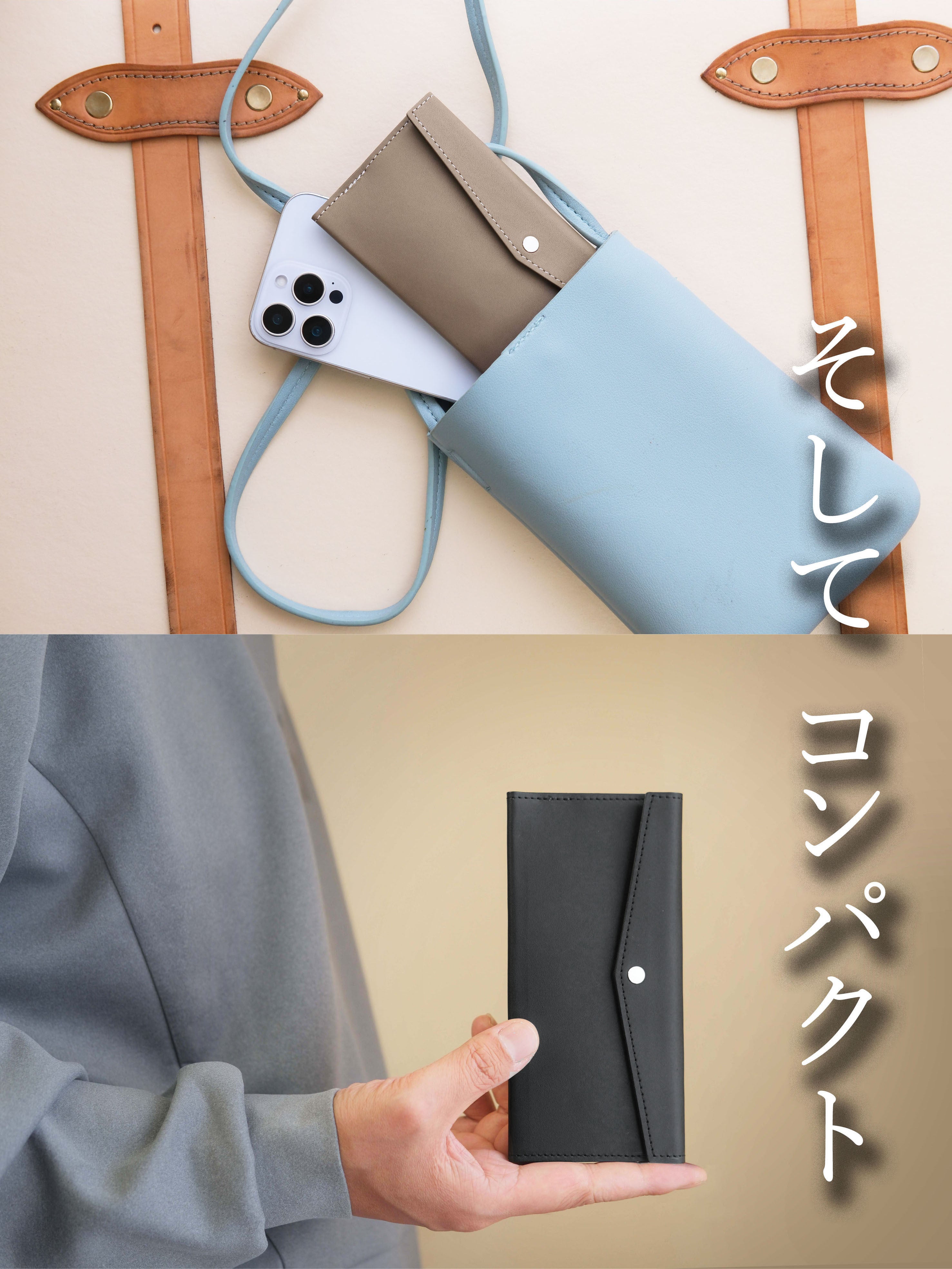 封筒のような平面のデザインにカードやコインポケットを効率よく配置し、中身を満載にしても圧倒的な薄さを実現。