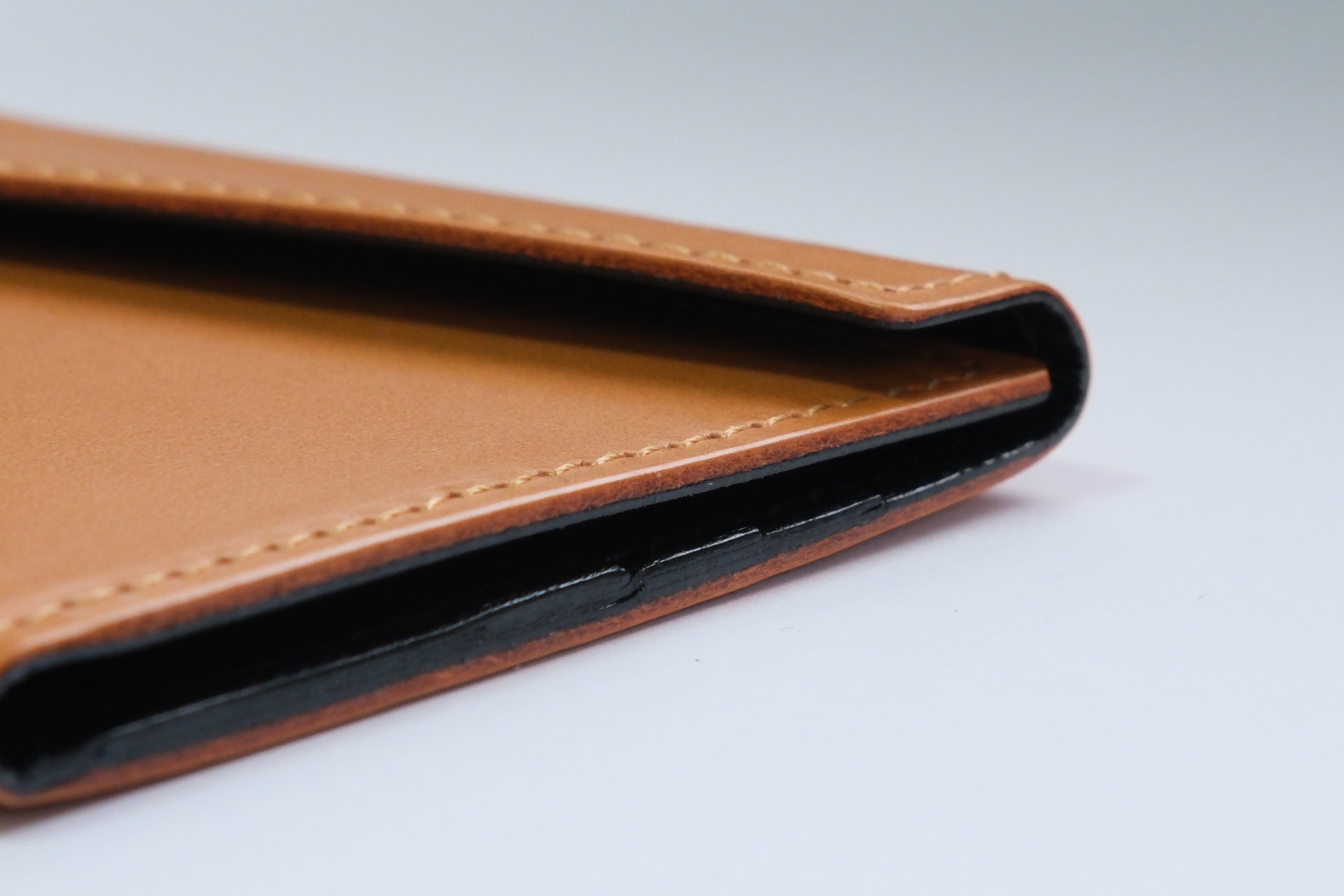 この中漉きした薄い革を綺麗に張り合わせることで、全体が張りのある財布に仕上がりながらも、曲がる部分のみ綺麗なRを描く財布に仕上がります。