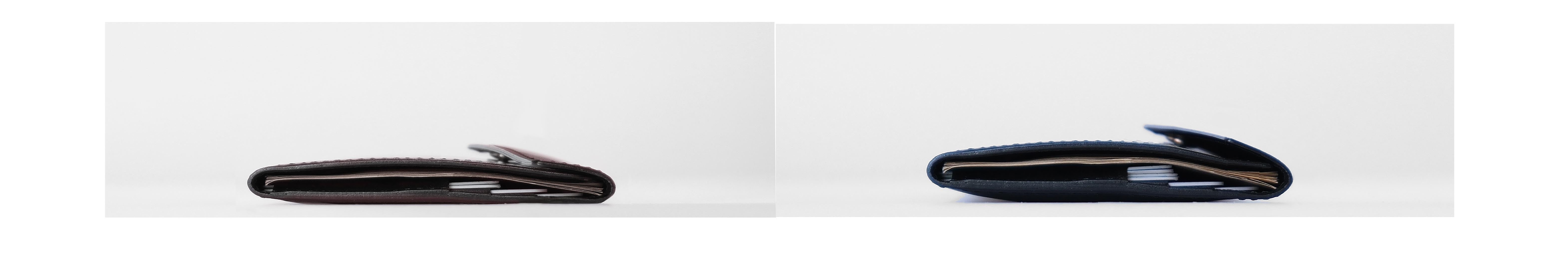 硬貨とカードが重ならない構造と革の重なりを出来る限り抑えたスリム設計により、必要十分な量が入ってこの薄さ。