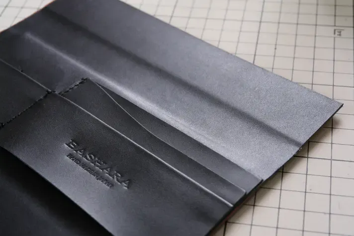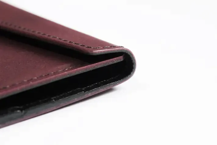 この中漉きした薄い革を綺麗に張り合わせることで、全体が張りのある財布に仕上がりながらも、曲がる部分のみ綺麗なRを描く財布に仕上がります。