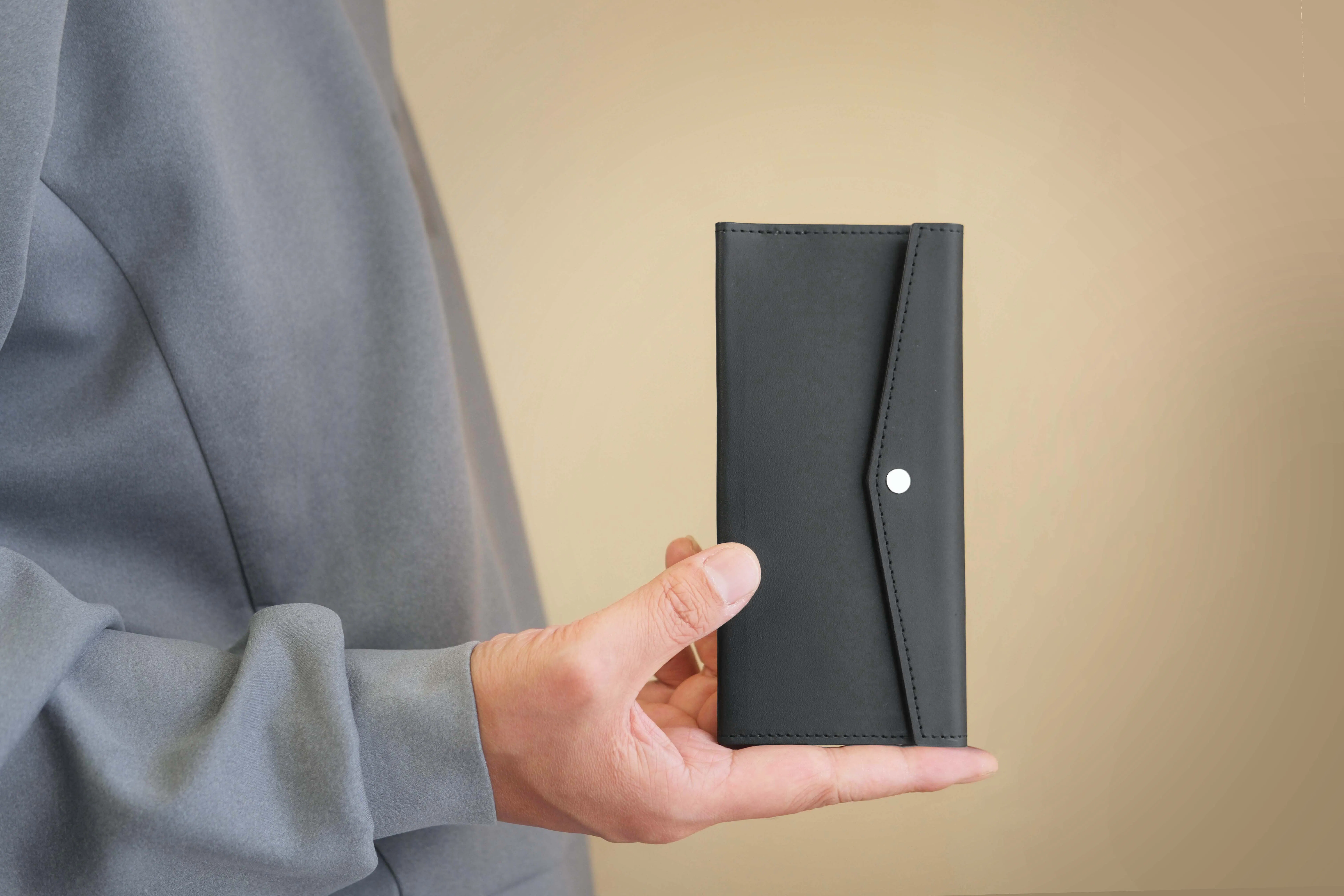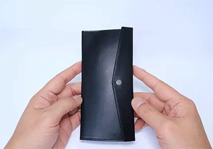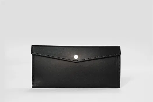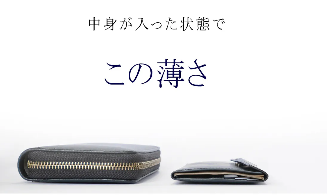 ファスナータイプやボックス型の財布と違い、封筒のように平面のデザインだから、中身が少なければ少ないだけスリムに。