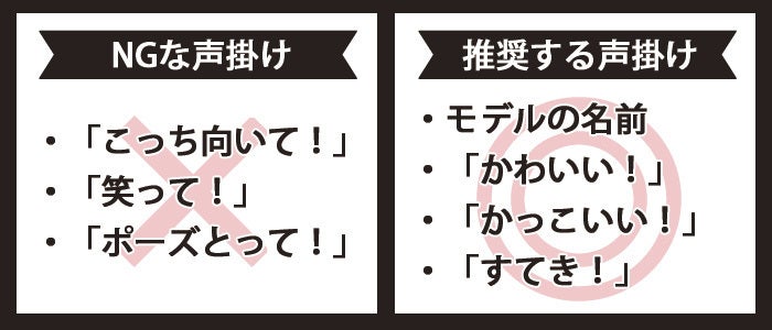 モデルたちのありのままの姿を写してください。ポージングやカメラ目線といった作られたものではなく、彼ら・彼女らの内側からあふれ出る魅力に目を向けて撮ってください。