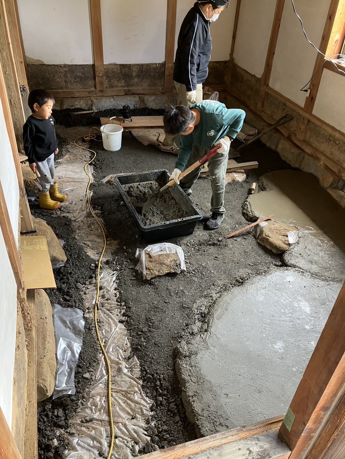 2025/04/05 19:48床下にコンクリートを打ちます。理由の一つは湿気対策ですが、もう一つあります。床下は夏でもひんやりしているので、自然の米保管庫にしようと思っています。砕石と砂を一輪車で運搬してセメントを投入し、手練りしてしています。(0.5㎥をこの3人で3日でやりました(T_T))見習い中の不肖の弟子たちですが、文句も言わずやりきりました!! もっと見る