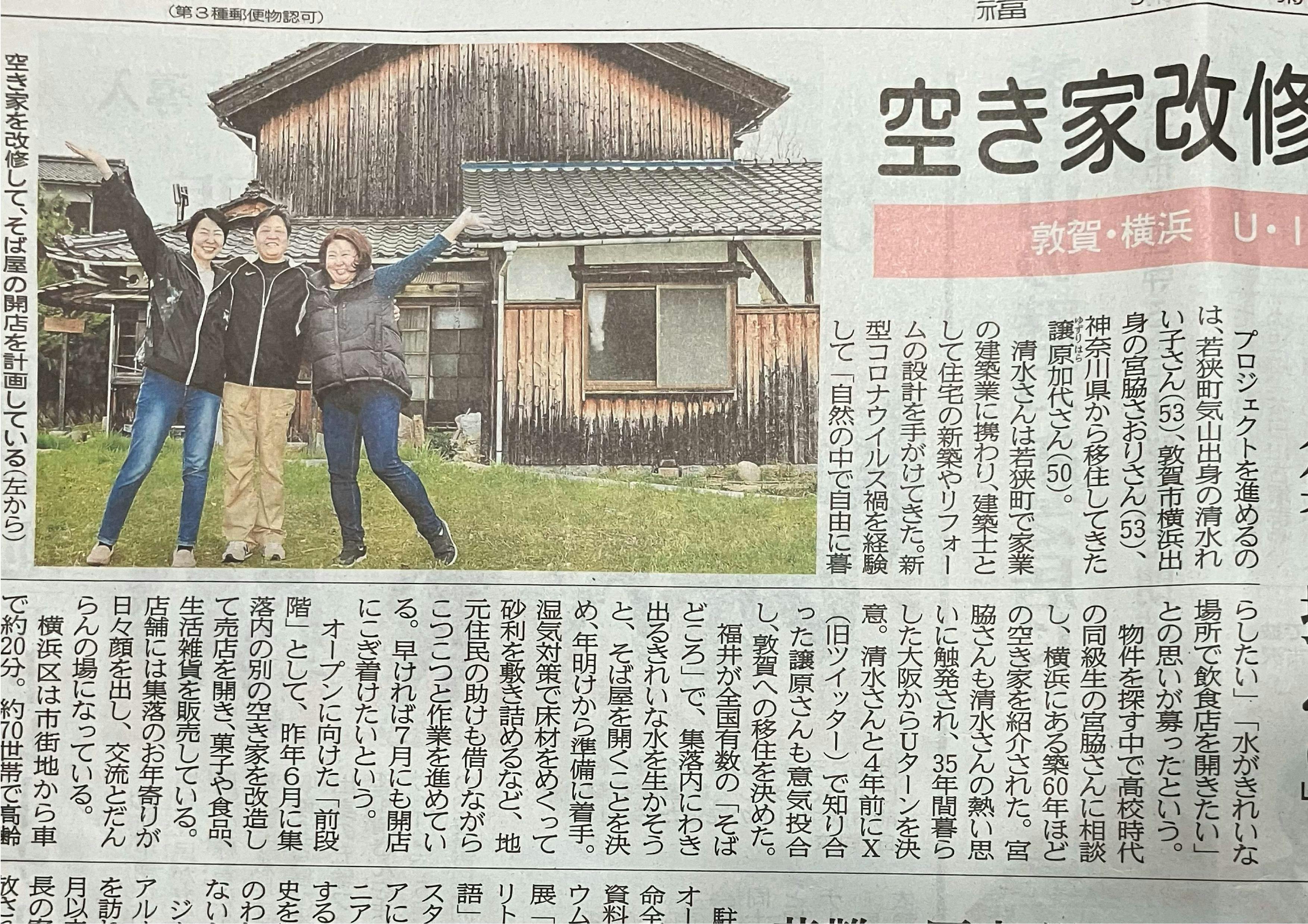 2025/04/15 19:17支援者の皆様!私たちのプロジェクトが新聞に載りました!(^^)/実はとてもありがたい事がありまして…私が借りている住まいの向かいの寺に、スイス人女性僧侶のジェシーさんが住職として着任されました。月2回ほど京都から寺に来るのですが、何もない場所のためうちに遊びに来るようになり「一緒にここを盛り上げよう!」という話になりました。昨年着任されてから全国的に注目され引っ張りだこになり、色んなメディアが寺を訪れるようになり、その度にこの蕎麦屋の事をアピールしてくれるんです。そういう経緯で今回載せて頂きました。明日は地元TVがジェシーさんに1日密着に来るので、またまたうちに来てくれるらしいのです。ご支援頂いたみなさんもですが、色んなご縁に感謝しています。いよいよこのキャンプファイヤーも終盤になってまいりました。皆様からキャンプファイヤーを通してのご支援と、直接頂いたご支援、合計で150万となりました。この景気の悪い時期に頂いたご支援です。本当にありがとうございます!今回ご支援頂いた皆様の思いを忘れる事がないように、蕎麦屋に名前を掲示しようと思っています。「東京都 鈴木一郎様」福井県なら「敦賀市横浜 鈴木一郎様」という感じです。もし、違う表現がよろしければメールで教えて下さい。みなさん!いつもありがとうございます! もっと見る弟子たちとコンクリート打ち