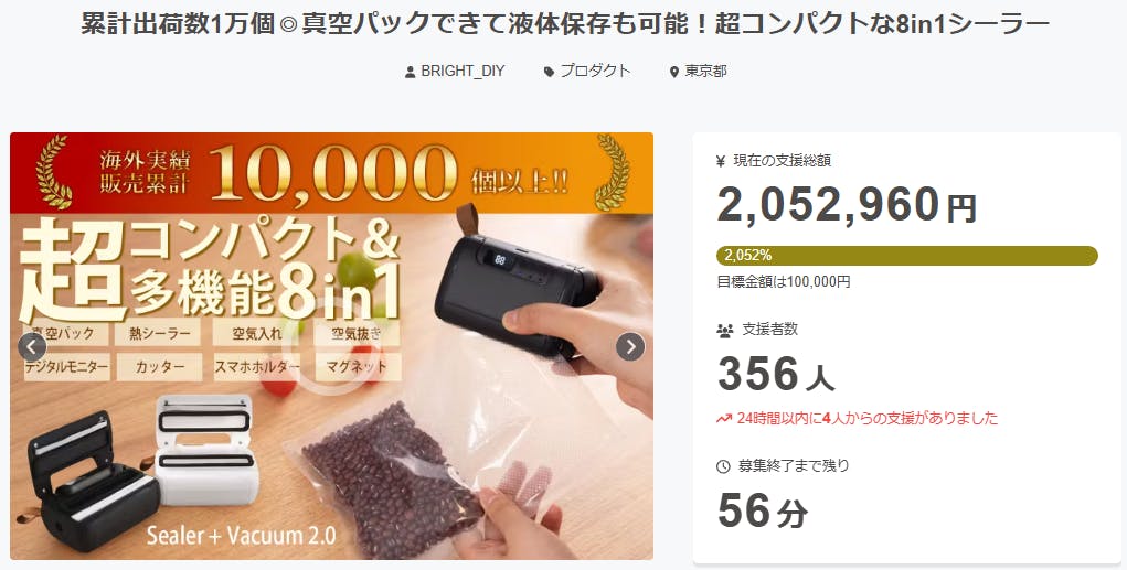ご支援者様、累計出荷数1万個◎真空パックできて液体保存も可能!超コンパクトな8in1シーラーにご興味をお持ちいただきありがとうございます。お陰様で、開始から支援総額205万円達成することができました!終了までわずか1時間となります。強力バキュームと熱シーリング機能を搭載し、8in1の多機能モデルにパワーアップしました!食材の真空保存はもちろん、ボールや浮き輪の空気入れ、布団の圧縮まで、これ1台で対応可能!家庭でもアウトドアでも活躍し、さまざまなシーンで便利に使えます。プロジェクト終了後、「累計出荷数1万個◎真空パックできて液体保存も可能!超コンパクトな8in1シーラー」をMachiya特別価格で入手することはできなくなりますので、ご支援がまだの方、追加支援をご検討の方はお急ぎくださいますようお願い申し上げます。ご興味のある方、ぜひ支援お願い致します。https://camp-fire.jp/projects/827081/viewBrightチームは、当プロジェクトをもっと多くの方に知っていただきたいと考えております。よかったら、FacebookやTwitter等のSNSでのシェア・拡散をお願い致します。#brightdiyどうぞよろしくお願い致します。Brightチーム