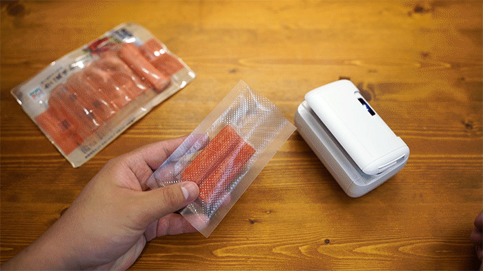 真空パッキングは袋を挟みながらボタンを押すだけでOK。入口は熱シーリングが同時に行われて完全密封に。