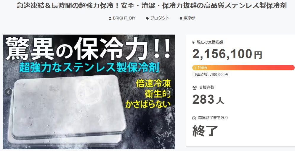 ご支援者様、急速凍結&長時間の超強力保冷!安全・清潔・保冷力抜群の高品質ステンレス製保冷剤にご興味をお持ちいただきありがとうございます。プロジェクト開始から33日目で283人ものご支援者の方々より支援頂き、無事プロジェクト終了を迎えることが出来ました。早速皆様のリターンを2025年08月末にお届けできるよう準備を始めております!皆様にご満足いただけるリターンをお届けできるよう、全力で取り組んで参りますので引き続き、「急速凍結&長時間の超強力保冷!安全・清潔・保冷力抜群の高品質ステンレス製保冷剤」をよろしくお願い致します。BRIGHTチーム