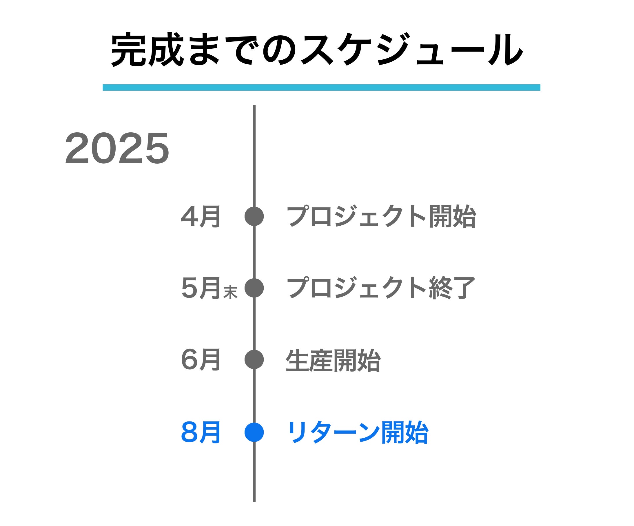 ※本文中に記載させていただいたスケジュールは、あくまでプロジェクト公開時点の予定です。クラウドファンディングを経て輸入を行う性質上、配送遅延のおそれがございます。