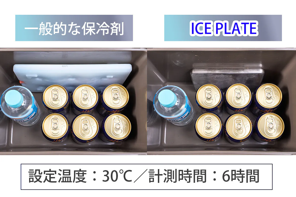 一般的な保冷剤とICE PLATEで6時間経過した時のクーラーボックス内の保冷温度を実際に比較実験してみました。