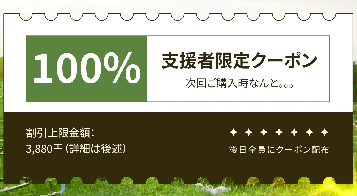※支援者様へのクーポン送付時に明記させていただきますので、ご安心ください。