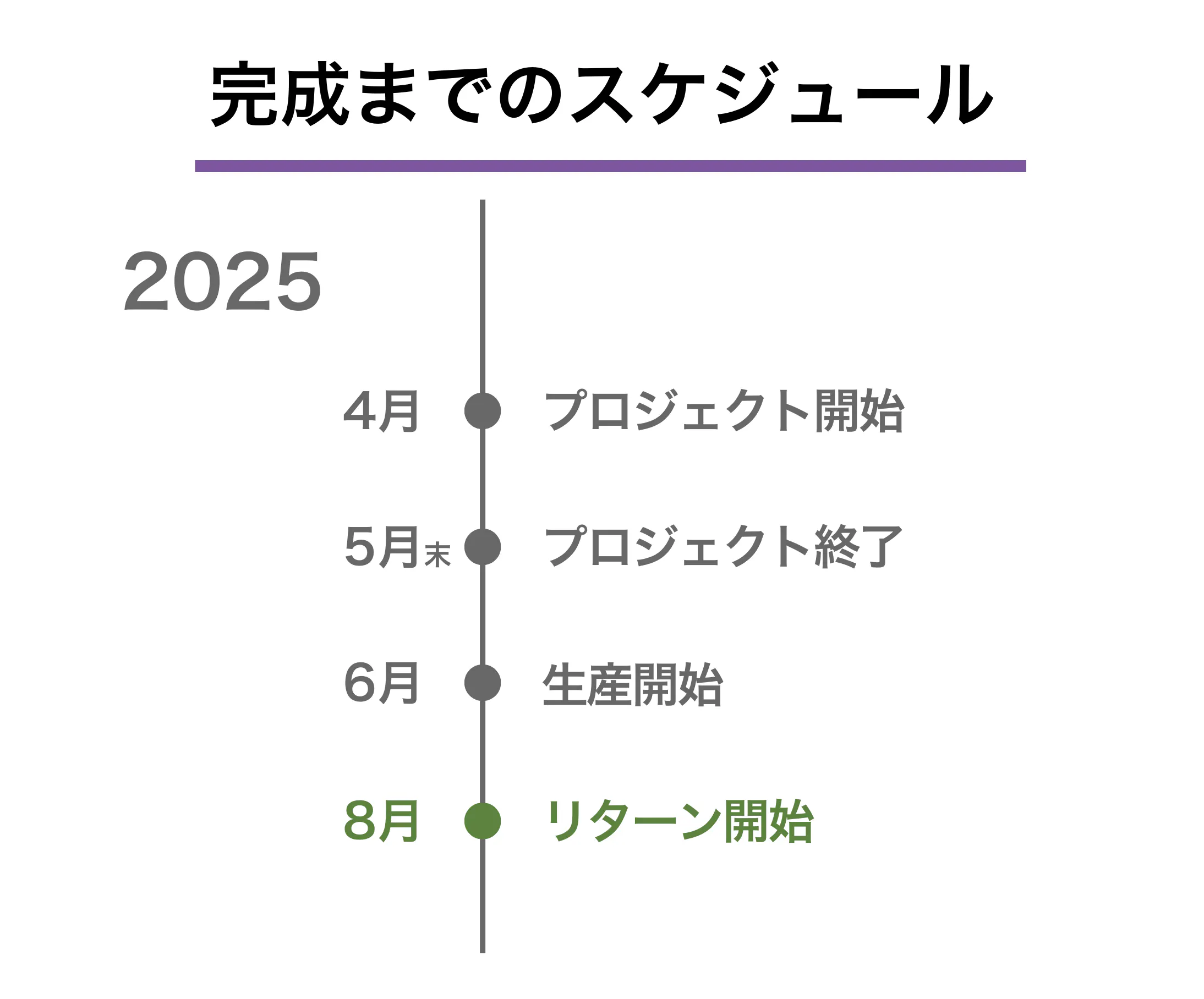 ※本文中に記載させていただいたスケジュールは、あくまでプロジェクト公開時点の予定です。クラウドファンディングを経て輸入を行う性質上、配送遅延のおそれがございます。