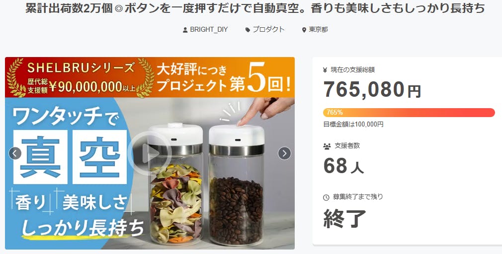 ご支援者様、累計出荷数2万個◎ボタンを一度押すだけで自動真空。香りも美味しさもしっかり長持ちにご興味をお持ちいただきありがとうございます。プロジェクト開始から44日目で68人ものご支援者の方々より支援頂き、無事プロジェクト終了を迎えることが出来ました。早速皆様のリターンを2025年09月末にお届けできるよう準備を始めております!皆様にご満足いただけるリターンをお届けできるよう、全力で取り組んで参りますので引き続き、「累計出荷数2万個◎ボタンを一度押すだけで自動真空。香りも美味しさもしっかり長持ち」をよろしくお願い致します。BRIGHTチーム
